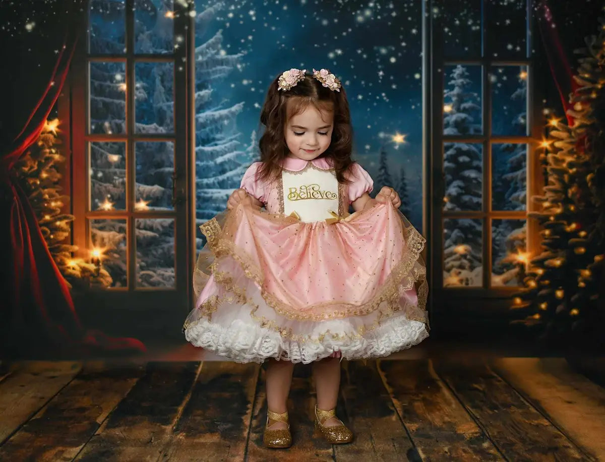 Create enchanting winter scenes with the Magical Winter Night Snowfall Backdrop. This beautifully detailed backdrop features a snowy forest viewed through an elegant window frame, perfect for festive portraits and seasonal photography. Enhance your photos with its cozy, sparkling ambiance and magical snowfall effect.