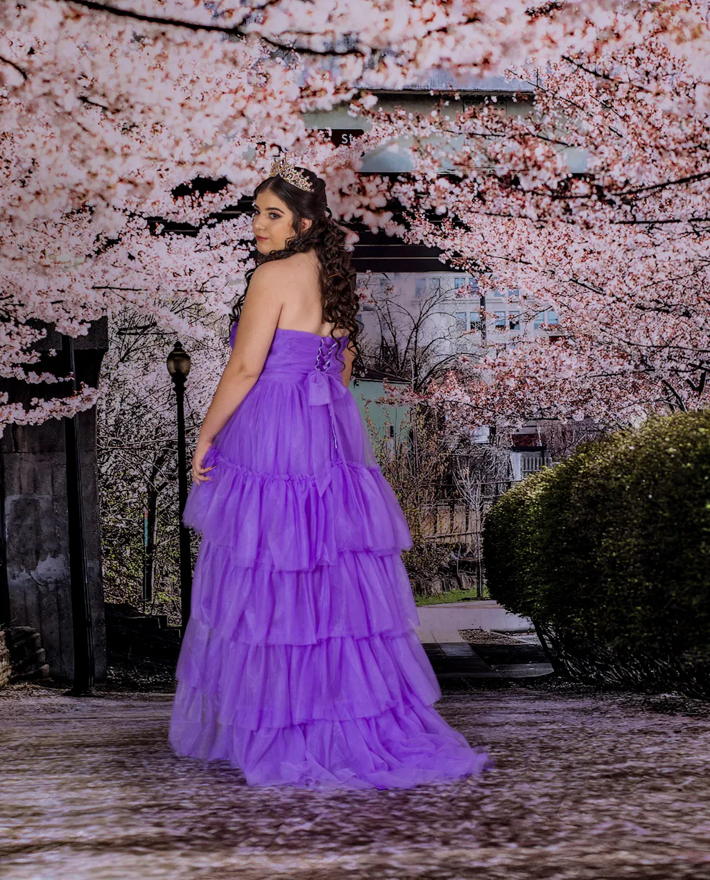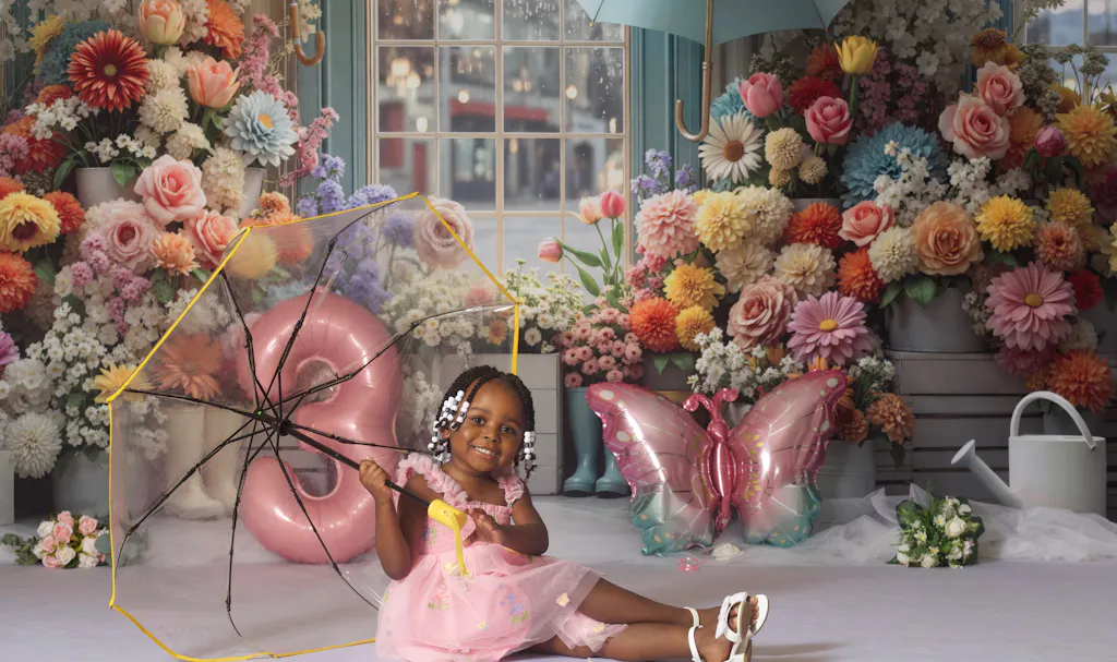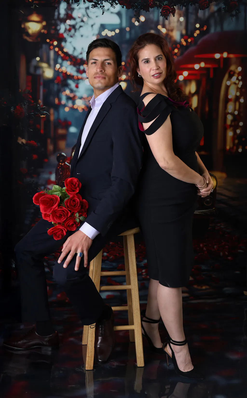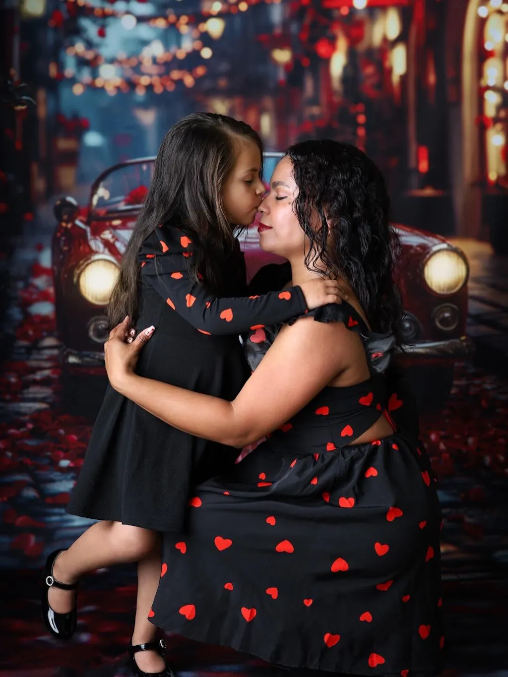 I am beyond impressed with this backdrop. The richness of the reds is incredible—it didn’t wash out under my lights and matched my daughter’s dress perfectly. What I love most is the realistic bokeh (the blurred background); it gives the photo so much depth that it looks like we were actually on a vintage street corner. The transition from the car to the cobblestone floor is seamless. Highly recommend for anyone looking for a high-end, editorial look! It came with the rose petals, heart shaped glasses and purse and the bouquet of roses