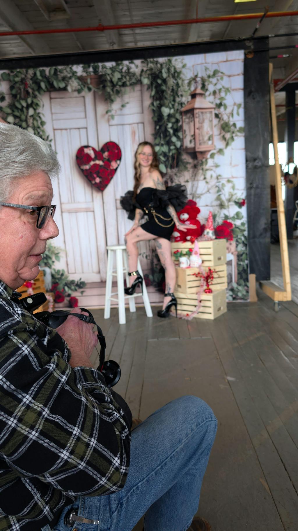 Transform your photography sessions with the charming Rustic White Door Romantic Rose Backdrop. Featuring a vintage white wooden door adorned with a vibrant heart made of red roses, surrounded by lush greenery and cozy lanterns. Perfect for capturing timeless romantic and elegant portraits with a rustic appeal.