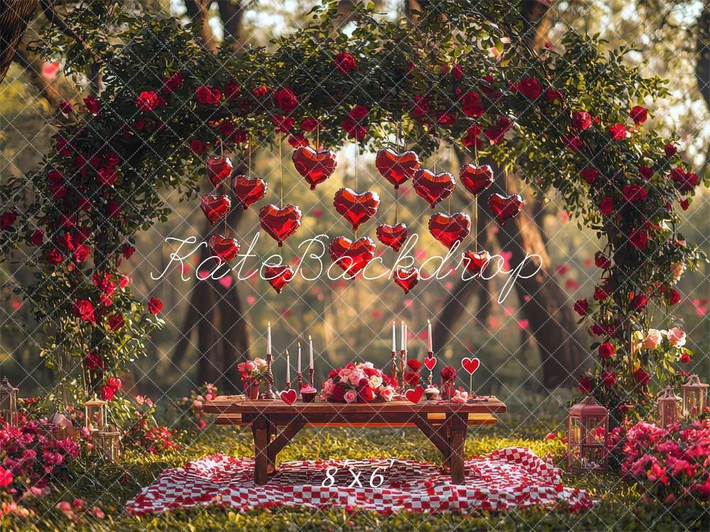 Create enchanting scenes with the Romantic Red Heart Floral Garden Backdrop. Featuring lush greenery, vibrant red roses, and floating heart decorations, this backdrop is perfect for captivating portrait photography, adding a dreamy romantic ambiance to any photo session.