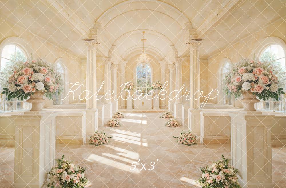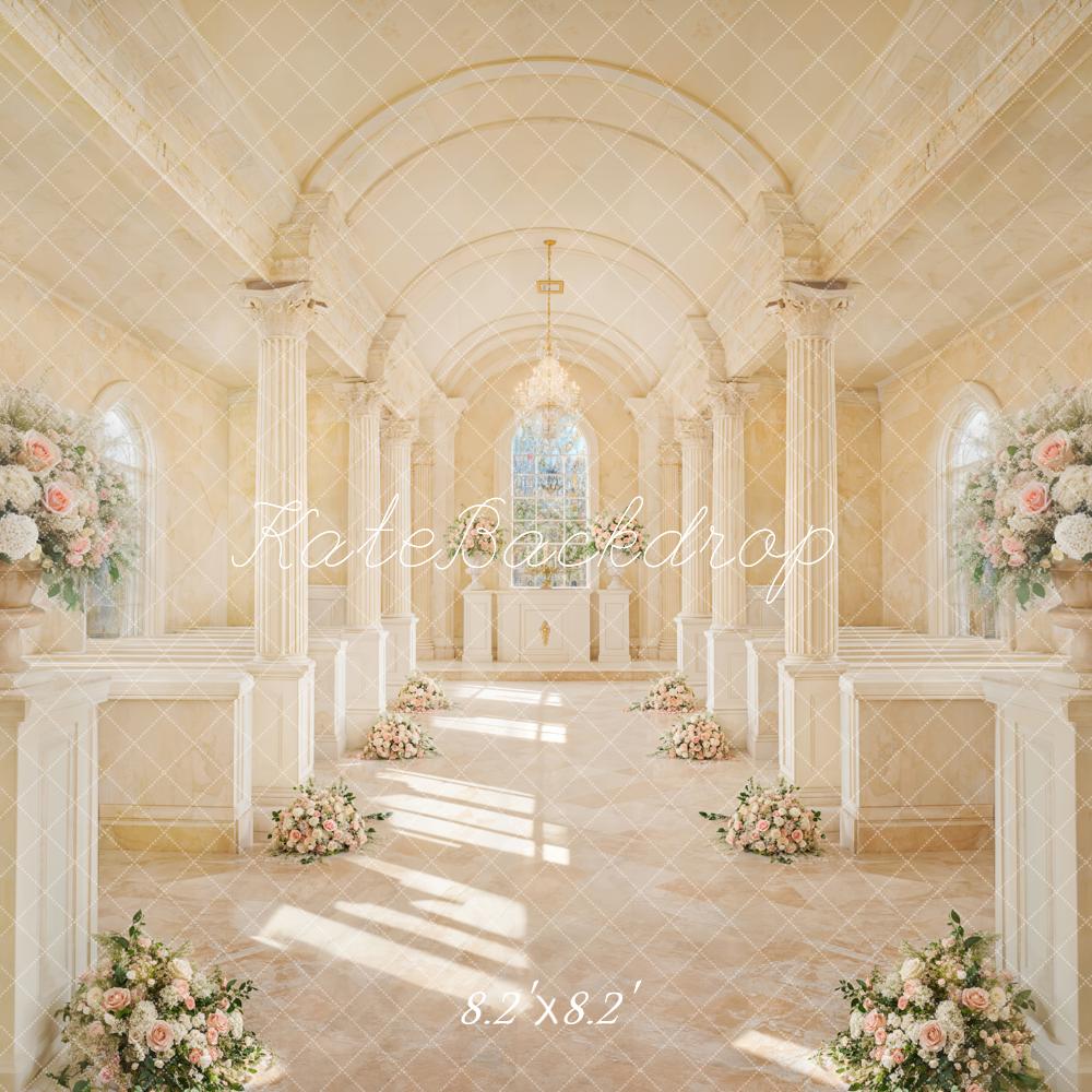 Transform your photo sessions with the Elegant Vintage Floral Cathedral Backdrop. This beautifully detailed backdrop showcases a sunlit cathedral interior adorned with soft pastel flowers, perfect for creating timeless and elegant portraits with a vintage charm.
