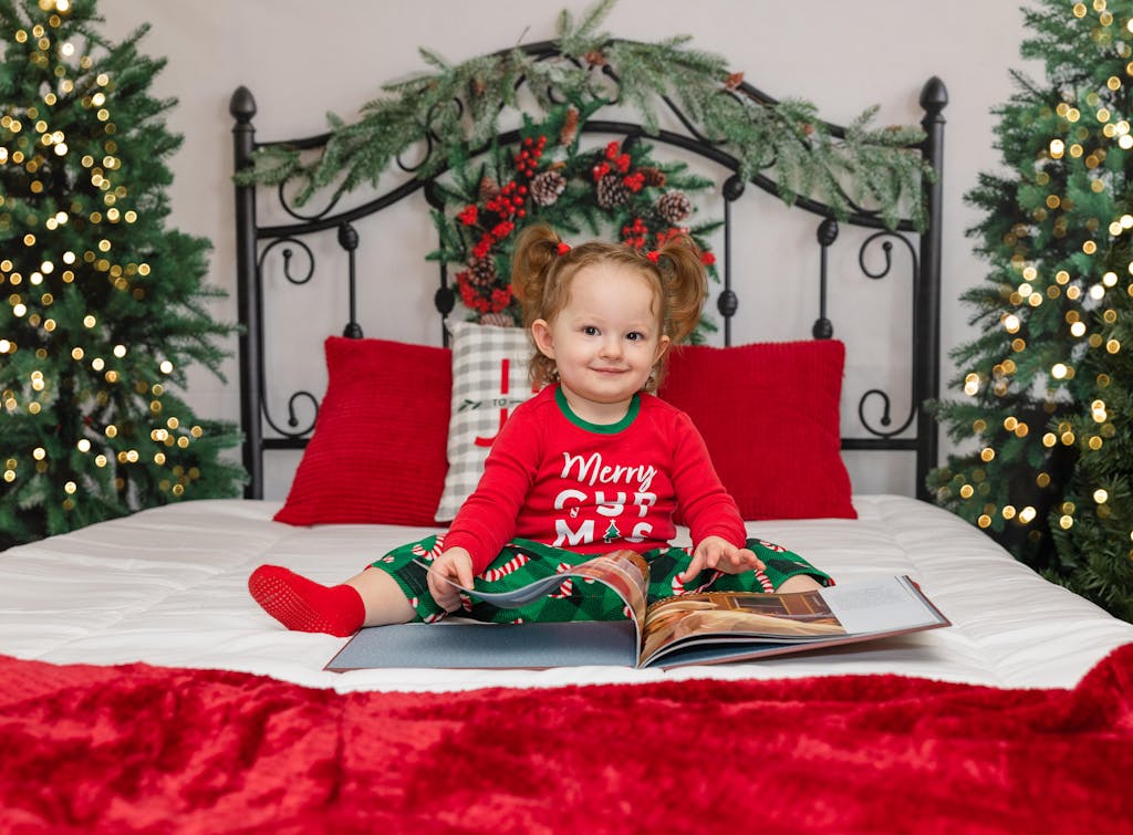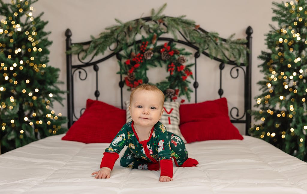 Create a cozy and festive atmosphere with the Festive Evergreen Holiday Backdrop Scene. Featuring lush evergreen trees, a decorative iron headboard, and a charming red berry wreath, this backdrop is perfect for capturing warm and inviting holiday portraits with a natural, elegant touch.
