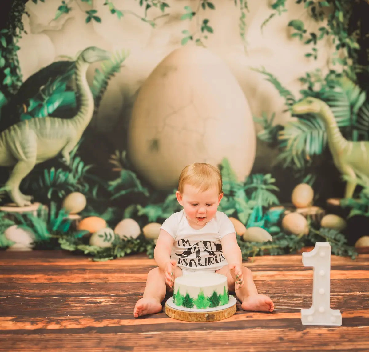 Create a prehistoric scene with the Dinosaur Egg Hatchling Adventure Backdrop. This unique design features a large cracked egg centerpiece surrounded by lush greenery and realistic dinosaur figures, perfect for captivating and imaginative photoshoots. Ideal for themed portraits and children's photography sessions.