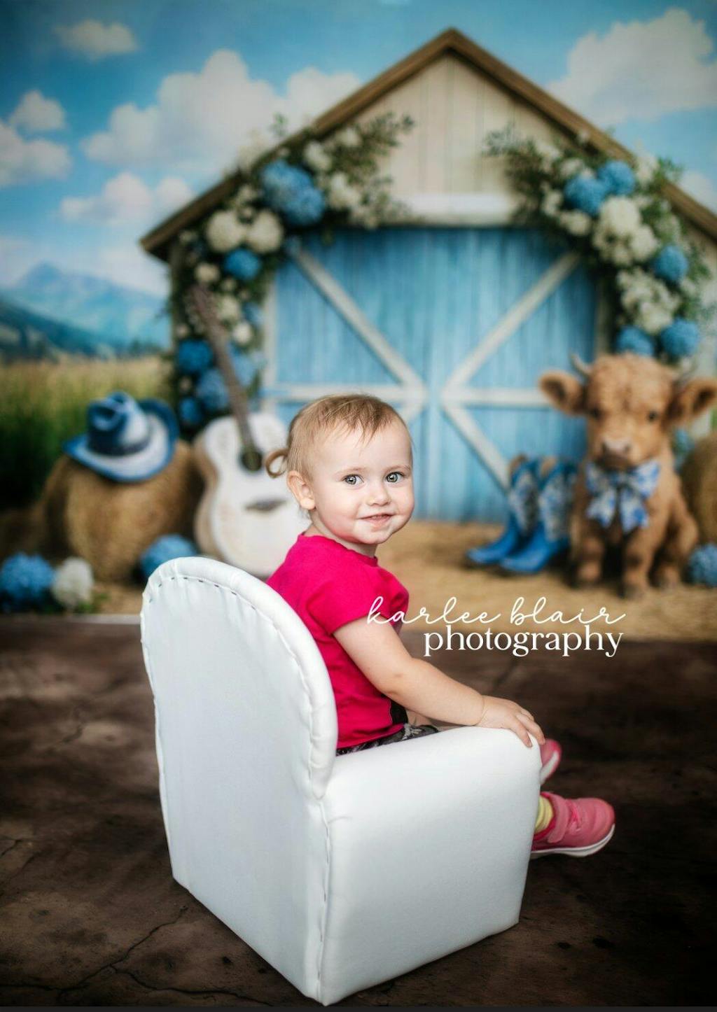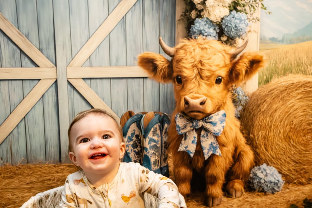 Create unforgettable memories with the Rustic Blue Barnyard Baby Backdrop. This charming design features a serene blue barn door, soft floral accents, and adorable rustic elements perfect for newborn and toddler photo sessions. Its authentic country vibe adds warmth and character to any portrait shoot.