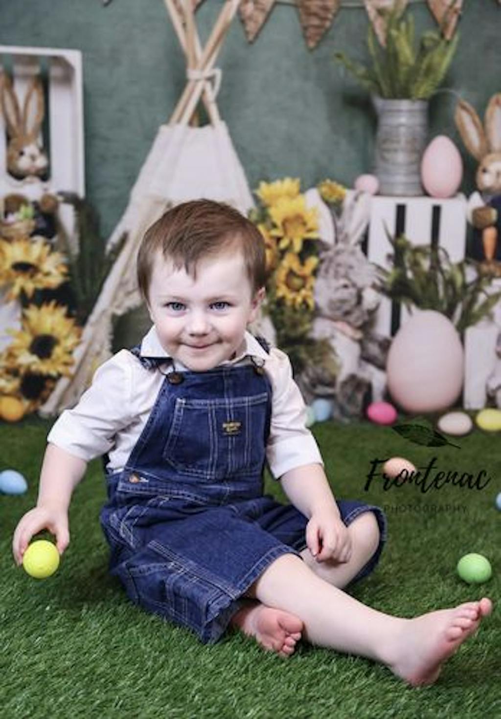 Capture charming portraits with the Rustic Springtime Bunny Garden Backdrop. Featuring vibrant sunflowers, pastel Easter eggs, and whimsical bunny decorations, this backdrop creates a warm, festive atmosphere perfect for seasonal photo sessions and family portraits.