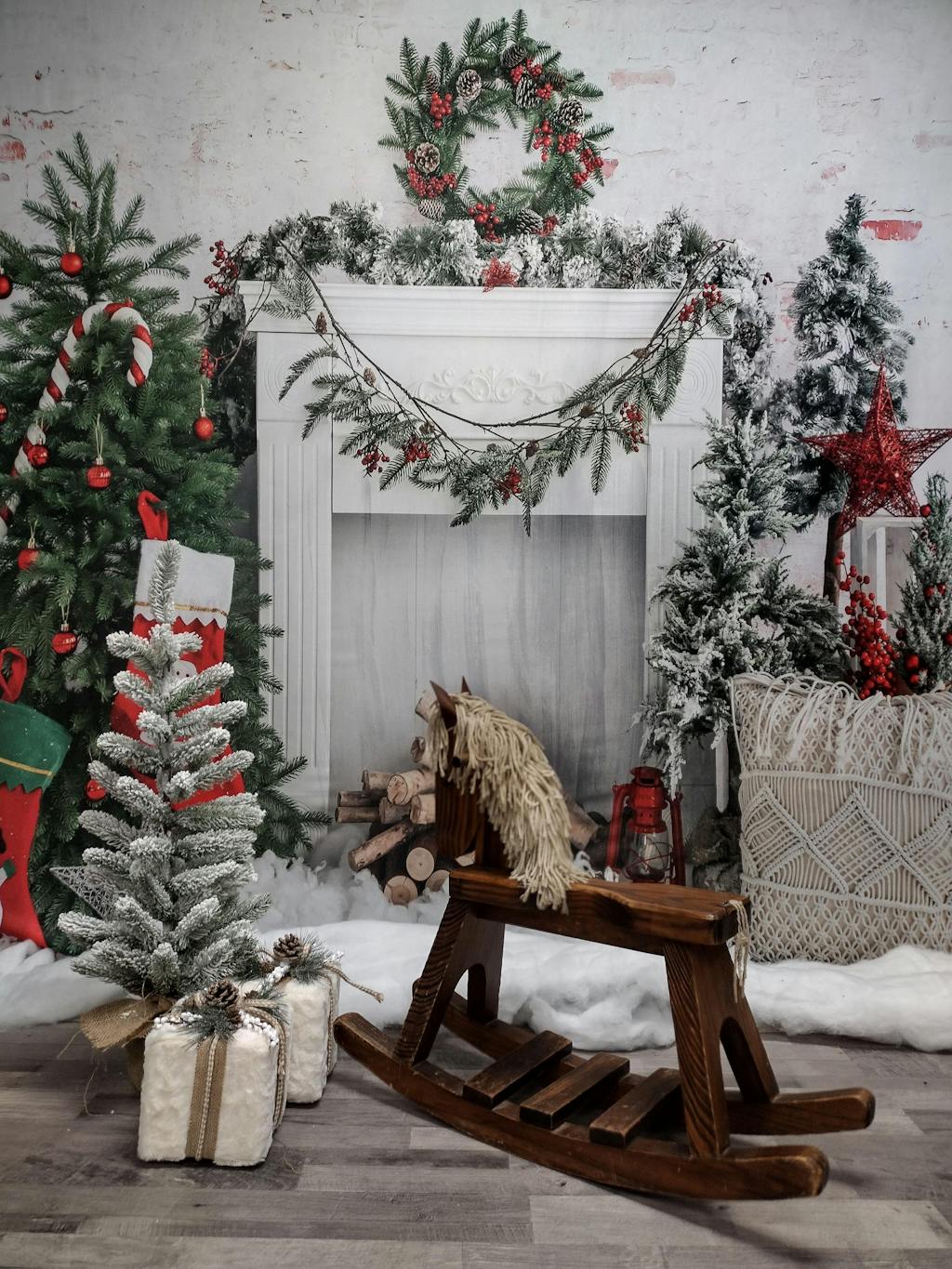 Create a warm and inviting atmosphere with the Cozy Festive Holiday Fireplace Scene backdrop. Featuring a beautifully decorated mantel, lush greenery, and classic holiday accents, this backdrop is perfect for capturing seasonal portraits with a charming and festive vibe.