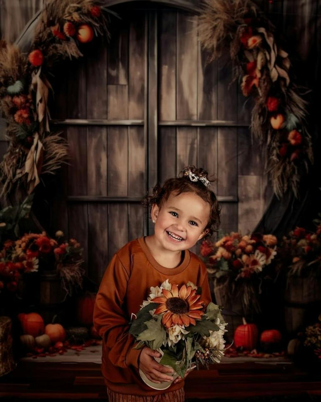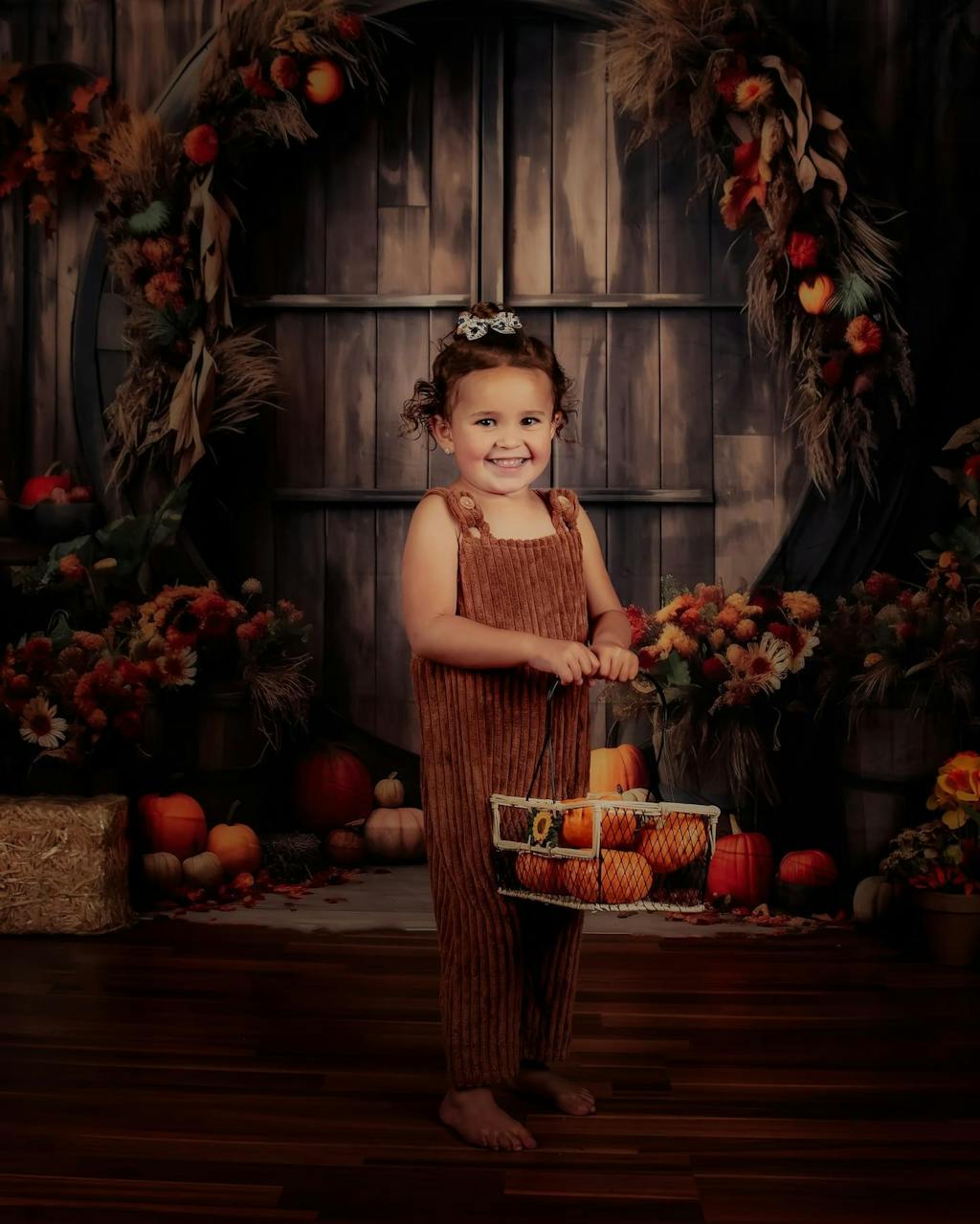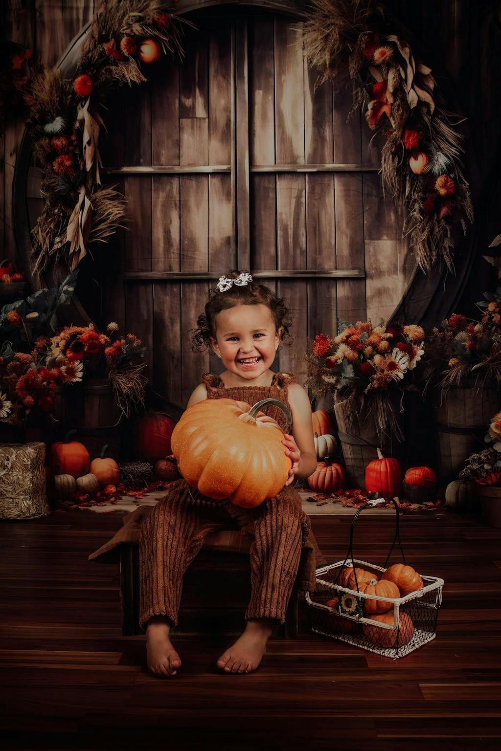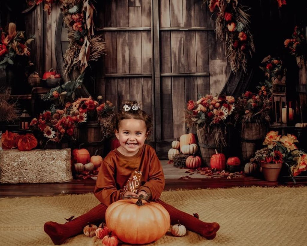 Enhance your seasonal portraits with the Rustic Autumn Harvest Pumpkin Backdrop. This unique backdrop features warm wooden textures and festive autumnal pumpkins and foliage, creating an inviting fall atmosphere perfect for cozy portrait sessions and holiday photo shoots.