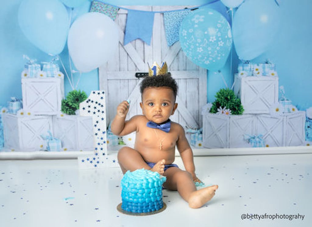 Create a charming and festive atmosphere with the Rustic Blue Barn Celebration Backdrop. Featuring a quaint weathered barn door with cheerful blue and white balloons, this backdrop is perfect for birthdays, baby showers, and joyful events. Its delicate floral accents and soft bunting add a whimsical touch for memorable portraits.
