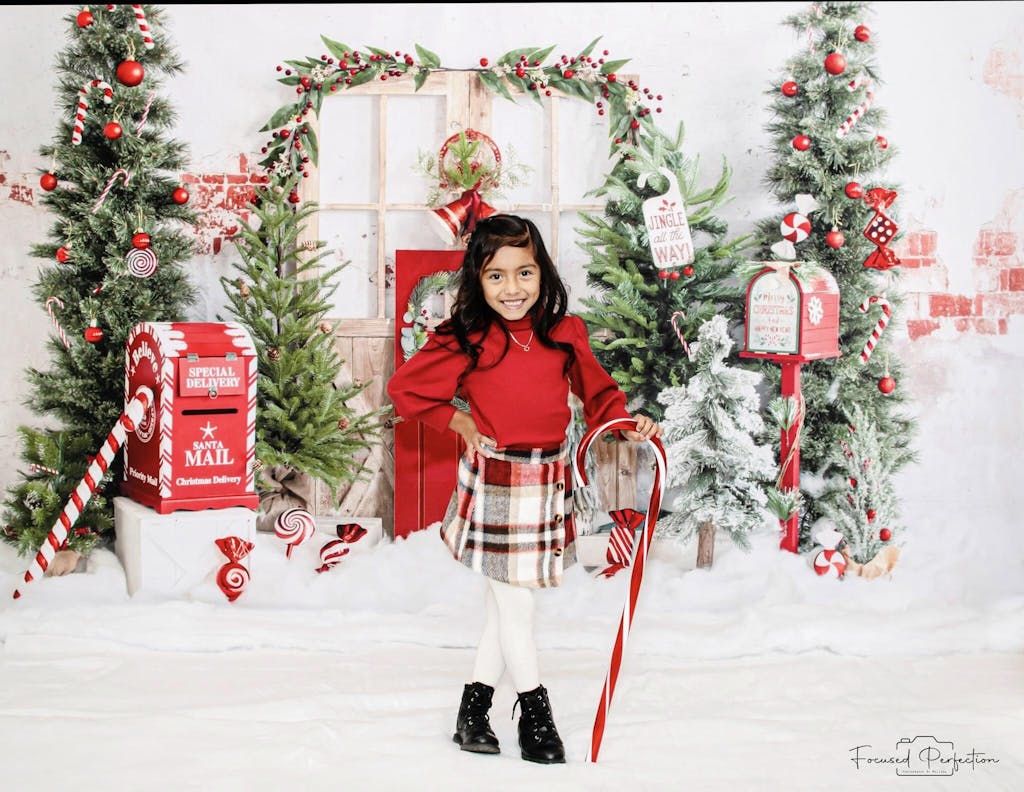 Capture the magic of the holidays with the Festive Vintage Christmas Mailbox Backdrop. Featuring charming rustic elements, frosted pine trees, and classic red and white candy accents, this backdrop is perfect for creating warm, seasonal portraits that evoke nostalgic Christmas cheer.