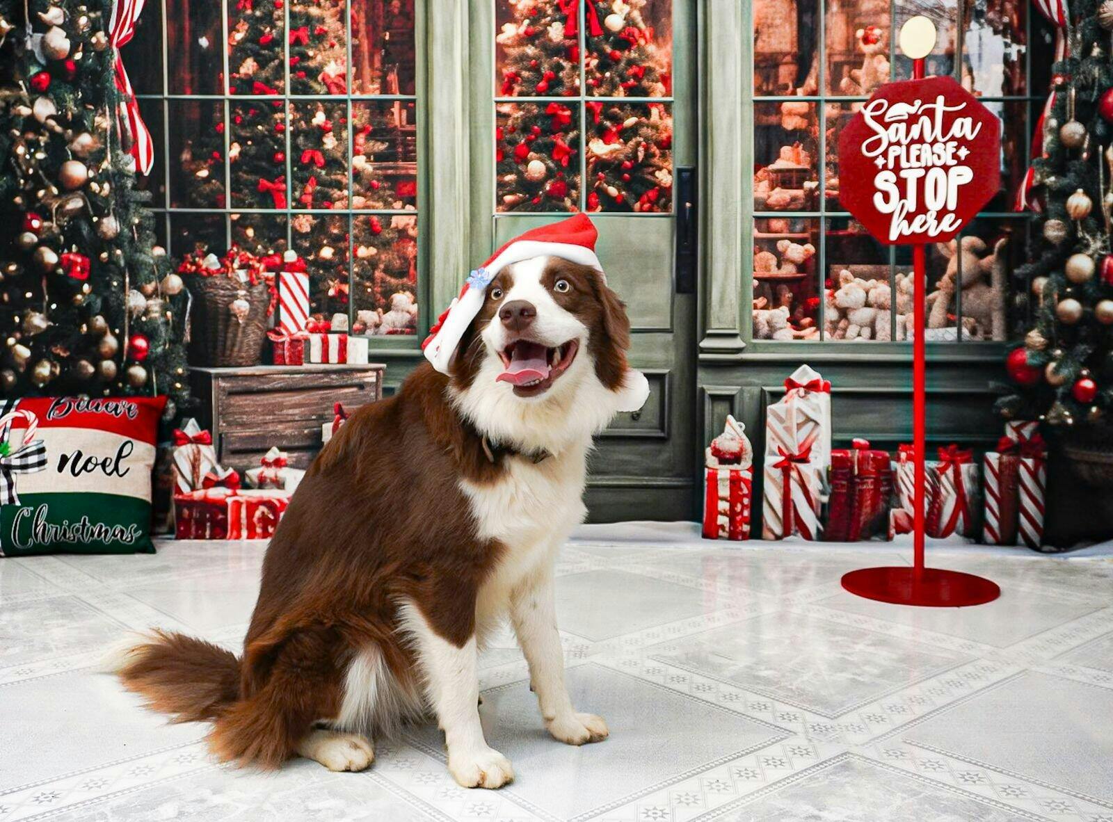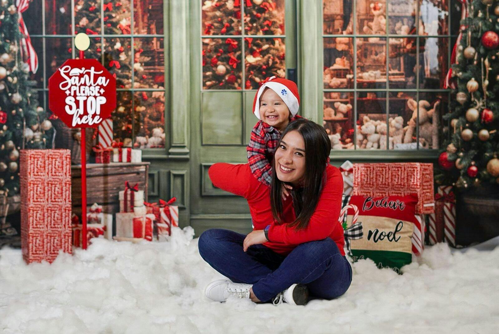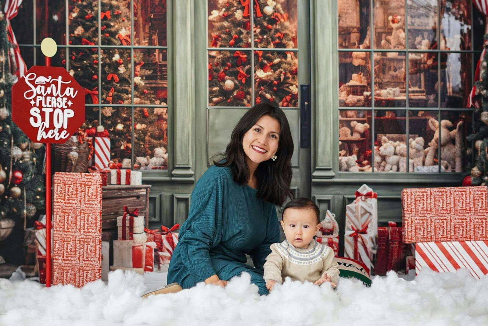 Create a warm holiday atmosphere with the Festive Cozy Christmas Window Display. This backdrop features beautifully decorated Christmas trees, wrapped gifts, and elegant garlands that bring festive charm and cozy vibes to your seasonal portraits and holiday photoshoots.