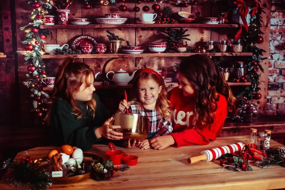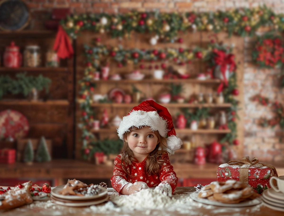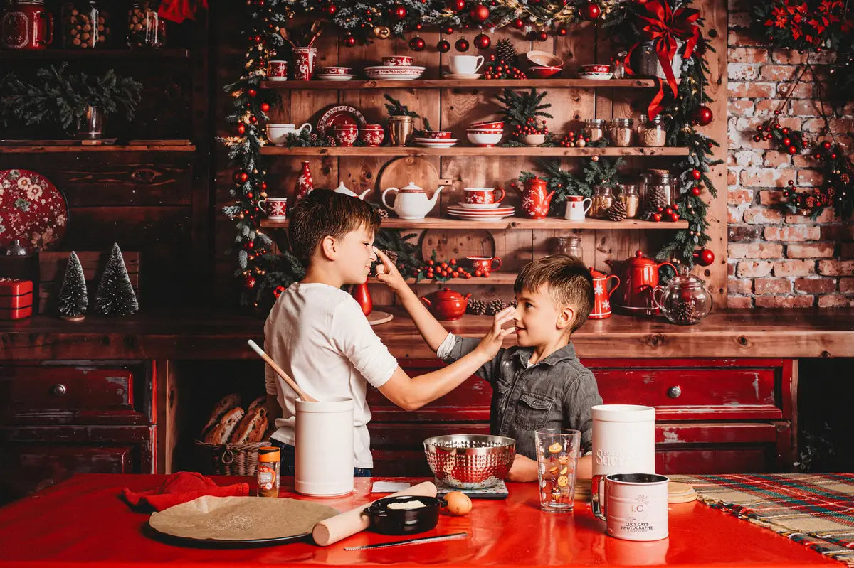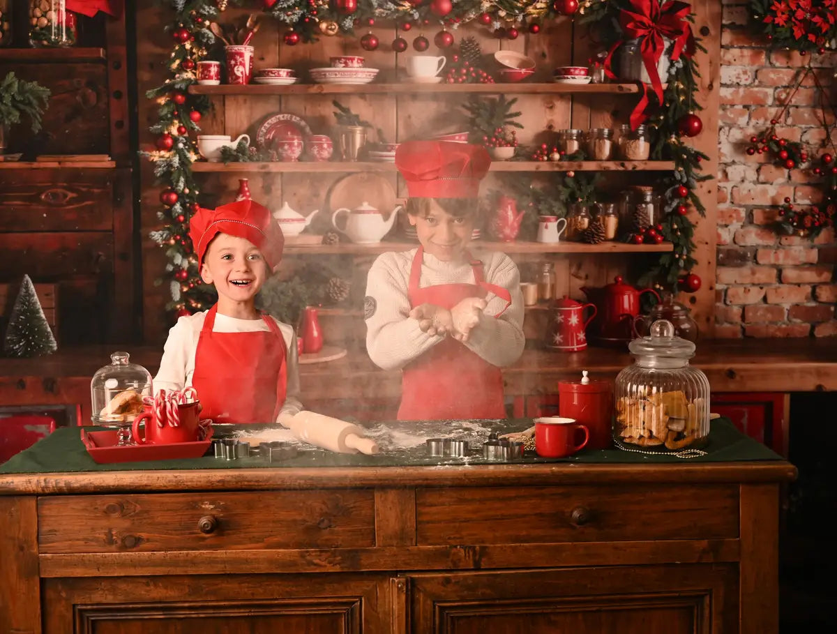 Capture warm holiday memories with the Rustic Festive Kitchen Holiday Backdrop. Featuring cozy wooden shelves adorned with seasonal garlands, red accents, and charming kitchenware, this backdrop adds a nostalgic and inviting vibe perfect for Christmas portraits and festive family photos.