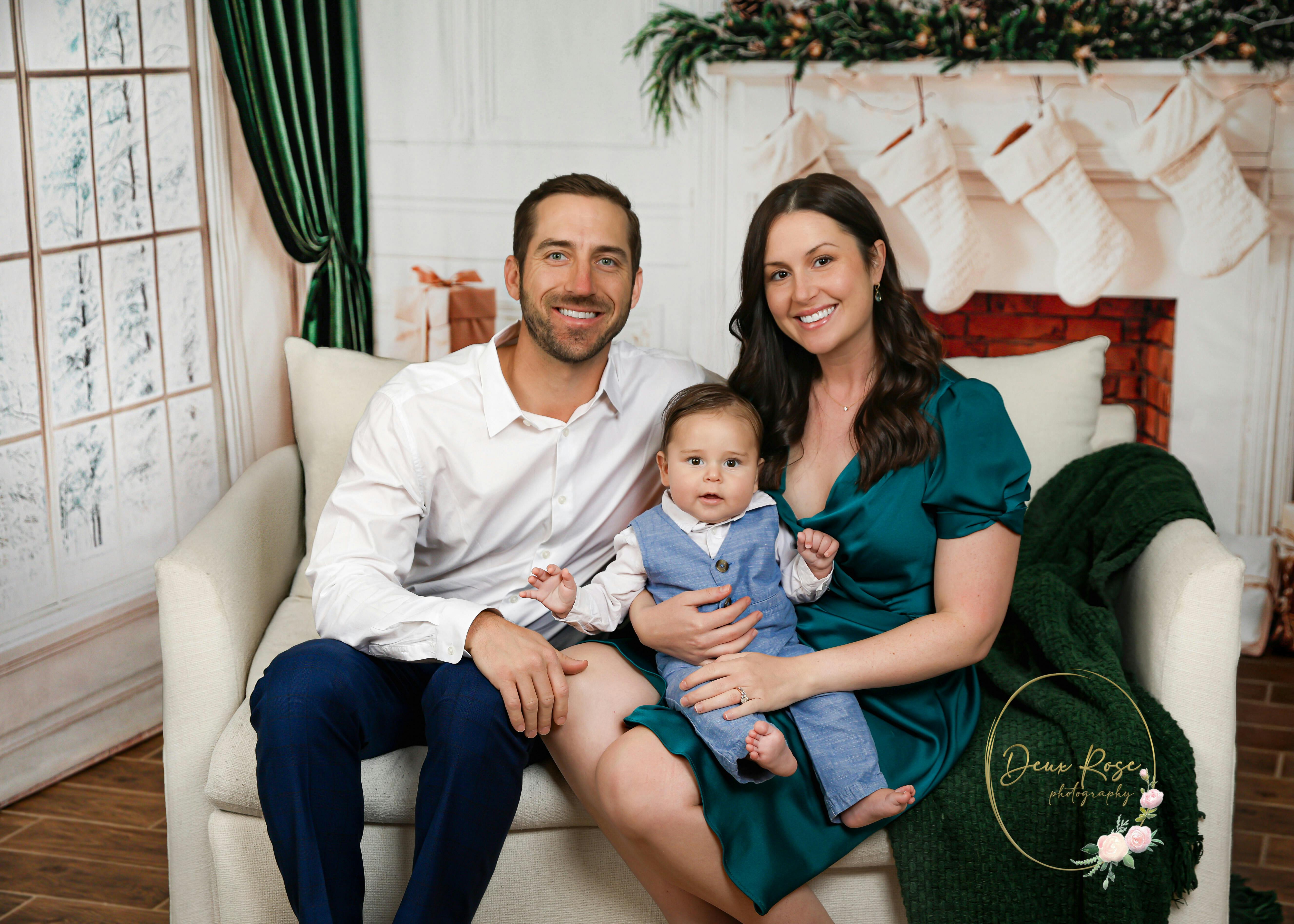 Create a warm and festive atmosphere with the Cozy Elegance Christmas Fireplace Backdrop. This beautifully designed backdrop features a glowing fireplace, decorated Christmas tree, and wrapped gifts, perfect for capturing memorable holiday portraits with charm and style.