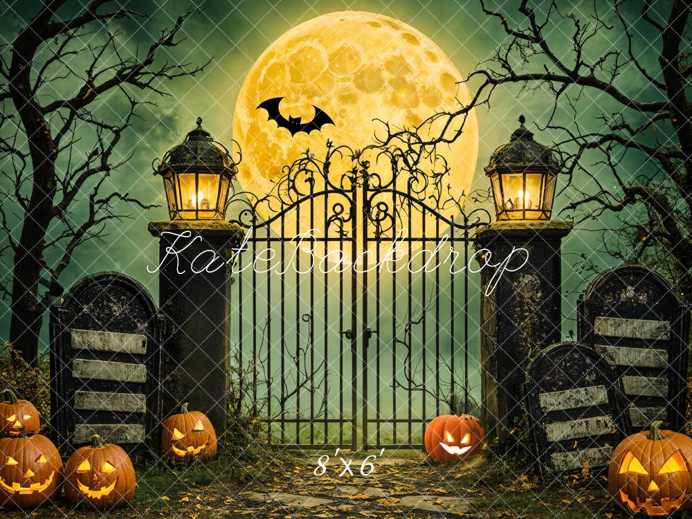 Create a chilling ambience with the Spooky Halloween Haunted Gate Backdrop. Featuring eerie glowing lanterns, jack-o'-lanterns, and a full moon with a flying bat, this backdrop is perfect for Halloween portraits and themed photo shoots to bring spooky vibes to life.
