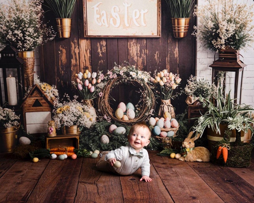 Create a warm and festive atmosphere with the Rustic Easter Spring Morning Backdrop. Featuring charming wooden textures, pastel-colored eggs, and fresh floral arrangements, this backdrop is perfect for seasonal portrait sessions and spring celebrations, enhancing every photo with a cozy, natural vibe.