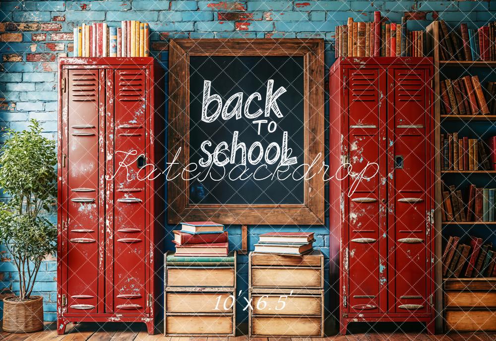Capture timeless academic vibes with the Vintage School Locker Chalkboard Backdrop. This backdrop features rustic red lockers, a blue distressed brick wall, and a chalkboard with a classic 'back to school' message, perfect for educational and nostalgic photo shoots.