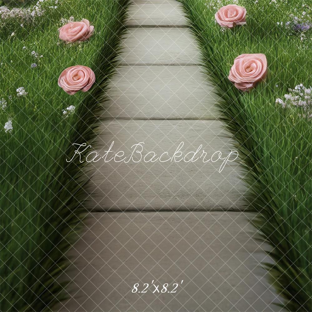 Create dreamy and enchanting portraits with the Romantic Garden Pathway Floral Backdrop. Featuring a serene pathway lined with lush grass and delicate pink roses, this backdrop adds a charming and whimsical touch to any photoshoot. Perfect for weddings, engagements, and spring-themed sessions.