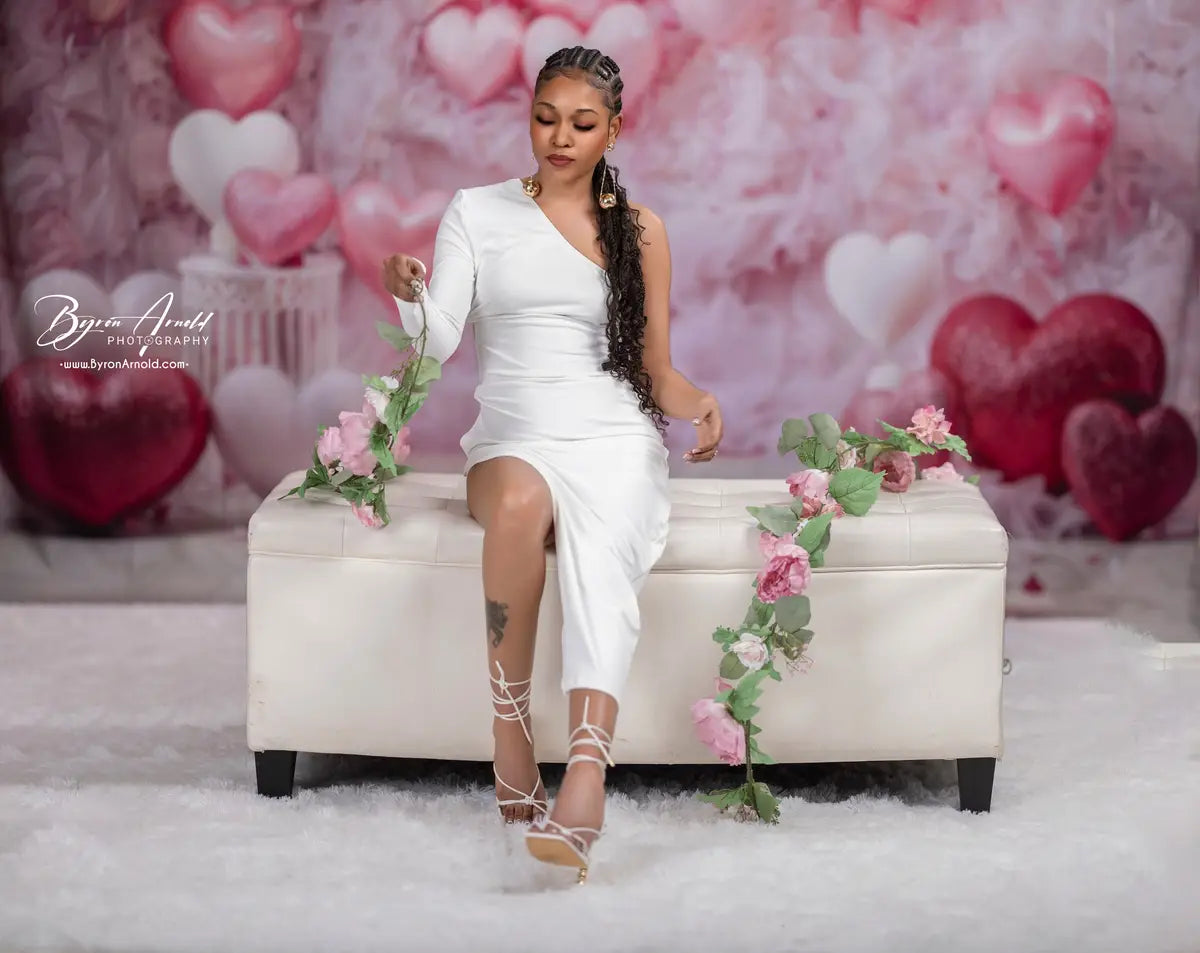 Create unforgettable memories with the Romantic Pink Heart Balloon Backdrop. Perfect for celebrations, this elegant backdrop features shimmering pink and white heart-shaped balloons with delicate ruffled fabric, adding a dreamy, romantic vibe to any photoshoot or event setting.