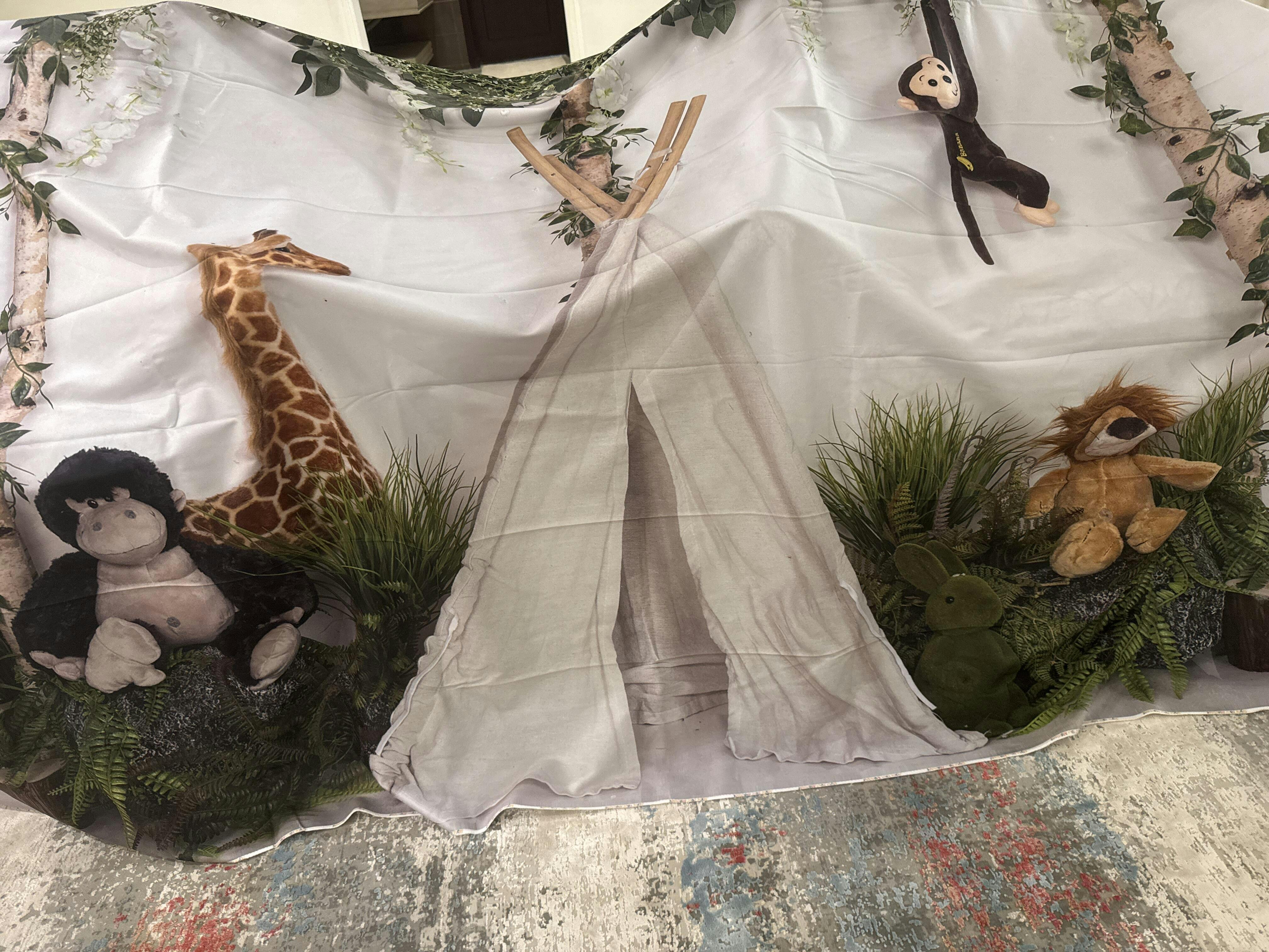 Create a fun and adventurous atmosphere with the Jungle Safari Kids Playroom Backdrop. Featuring lush green foliage, playful stuffed jungle animals, and a cozy teepee tent, this backdrop brings vibrant energy and whimsical charm to children's photography and playroom decor.