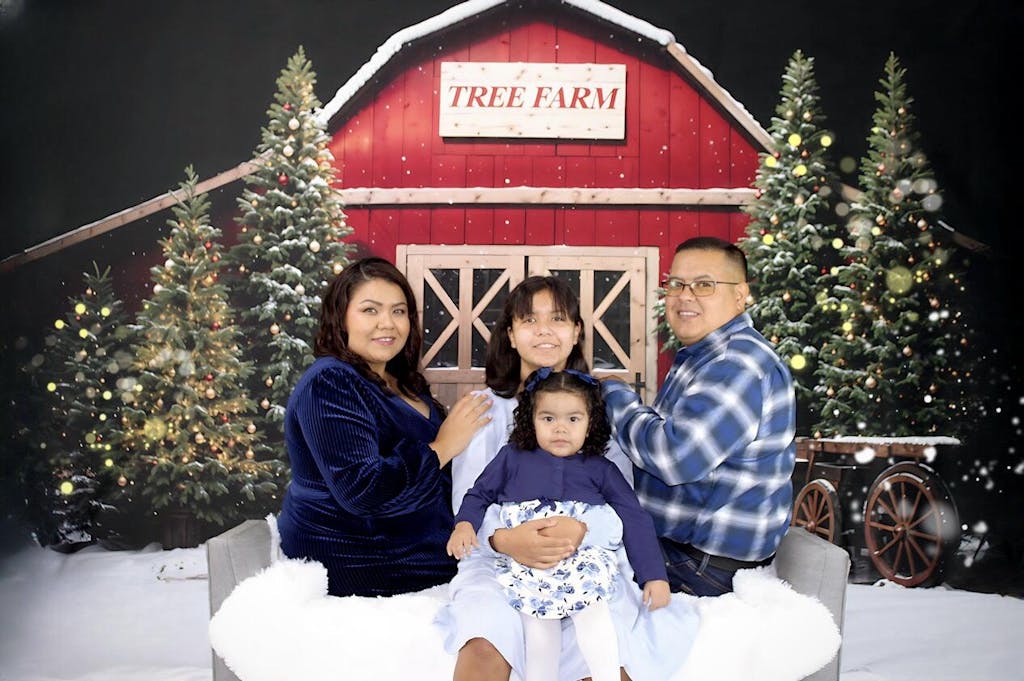 Create magical holiday portraits with the Rustic Winter Tree Farm Backdrop. Featuring snow-covered pines, warm wooden barn doors, and festive string lights, this backdrop delivers cozy winter charm perfect for seasonal photo sessions and Christmas-themed photography.