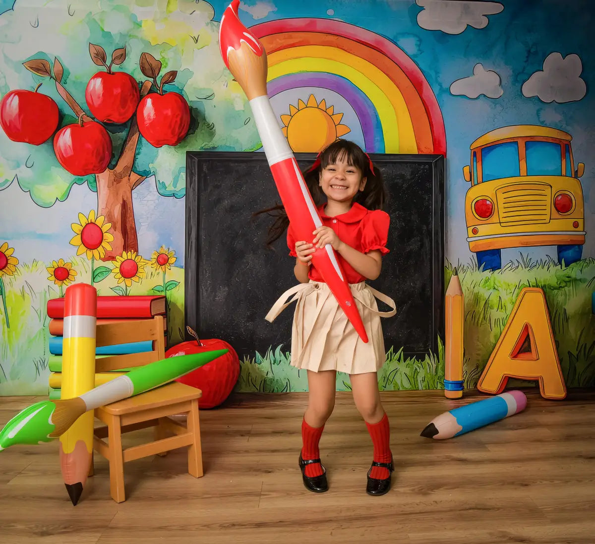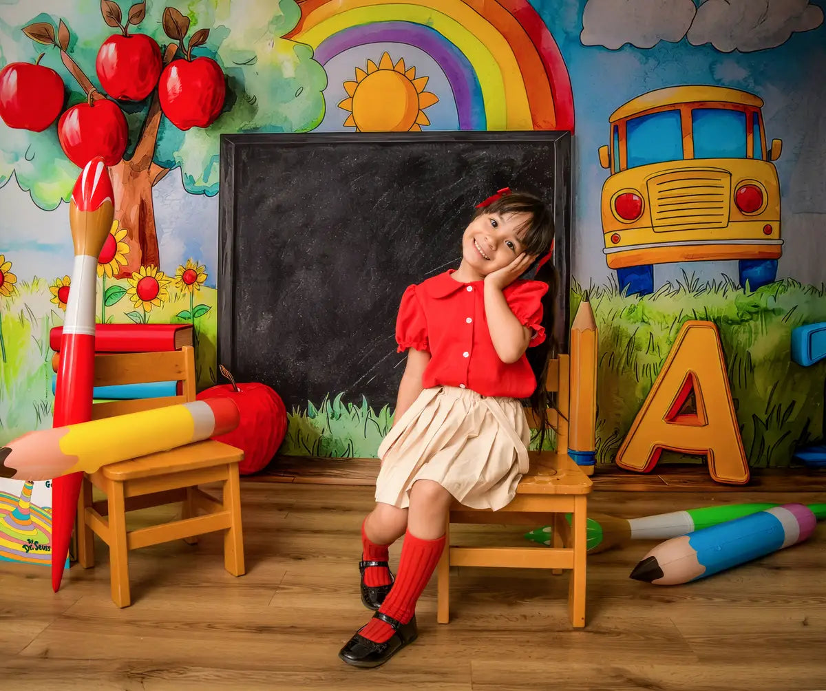 Brighten your photo sessions with the Colorful School Year Chalkboard Backdrop, featuring vibrant classroom-themed illustrations. This unique backdrop showcases playful elements like a rainbow, school bus, and apple tree, perfect for capturing fun and memorable school portraits.