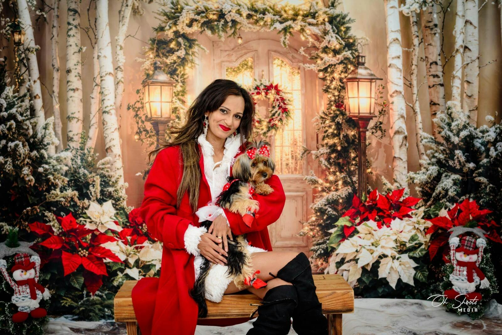 Create a warm and inviting holiday scene with the Festive Winter Holiday Doorway Backdrop. Featuring a beautifully decorated door framed by twinkling lights, lush poinsettias, and snowy evergreens, this backdrop adds festive charm and seasonal elegance to any portrait or event photography setup.