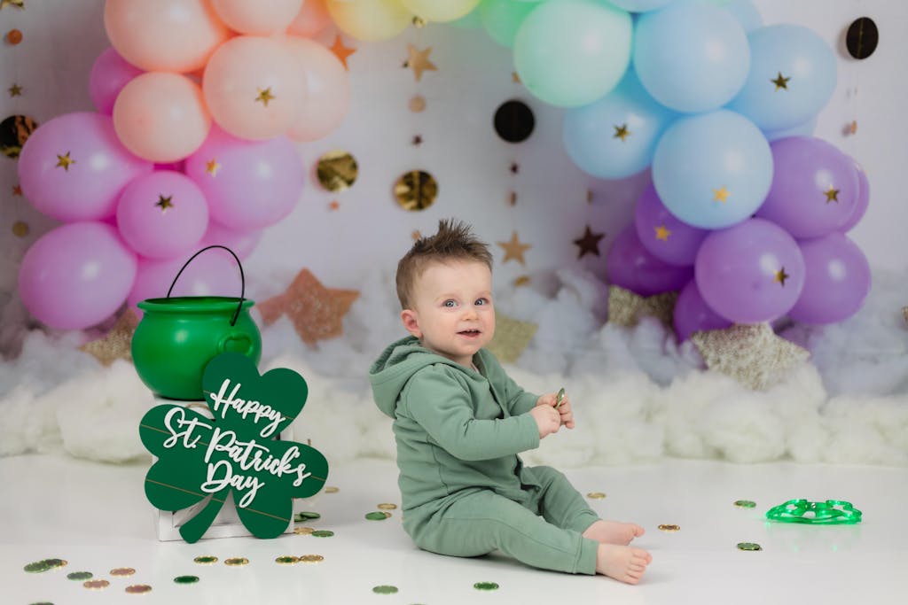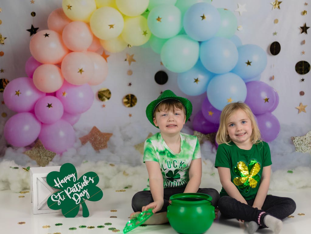 The Rainbow Balloon Arch Celebration Backdrop brings a magical and festive ambiance to any portrait session. Featuring a beautiful gradient of soft pastel balloons adorned with gold star accents and complemented by shimmering gold hanging decorations, this backdrop is perfect for joyful, whimsical, and themed photo shoots.