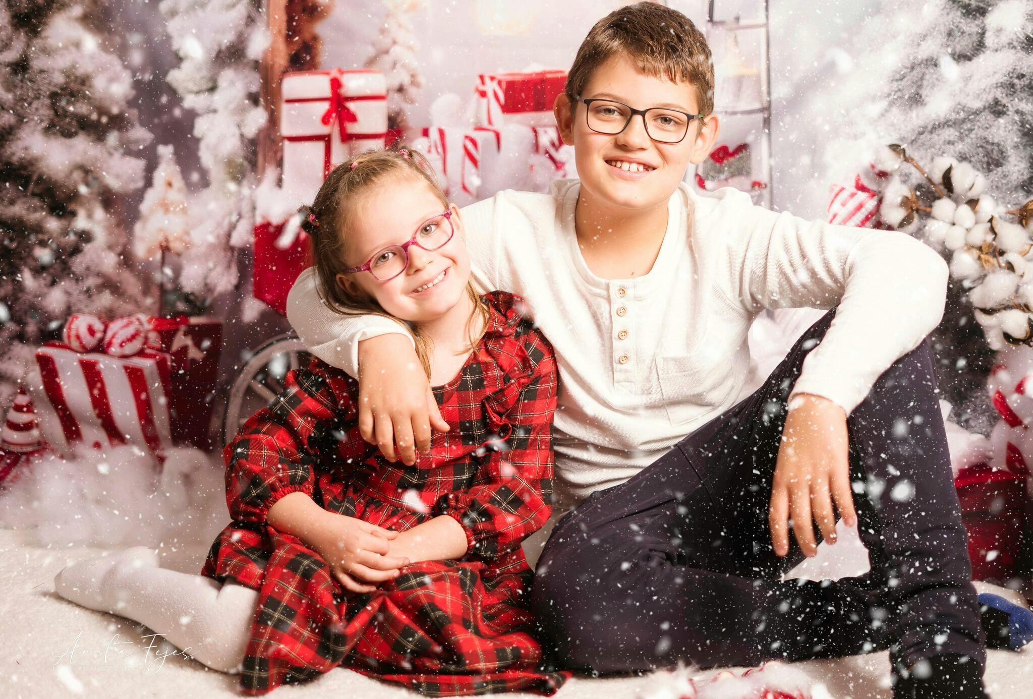 Create magical holiday portraits with the Winter Wonderland Festive Holiday Backdrop. Featuring snowy pine trees, glowing lights, and beautifully wrapped gift accents, this backdrop sets a cozy and cheerful scene perfect for Christmas and winter celebrations. Its soft snowfall effect adds an enchanting touch for timeless seasonal photography.