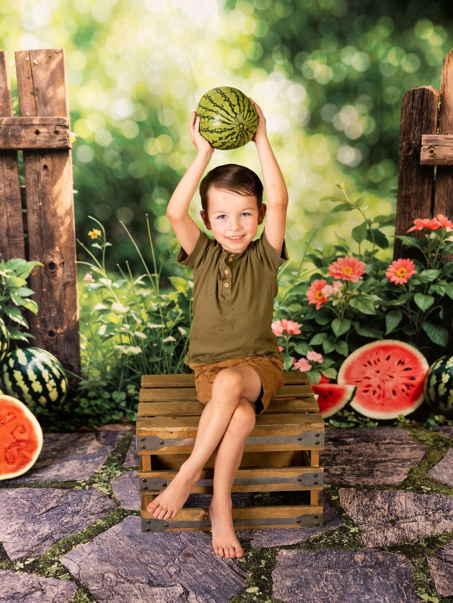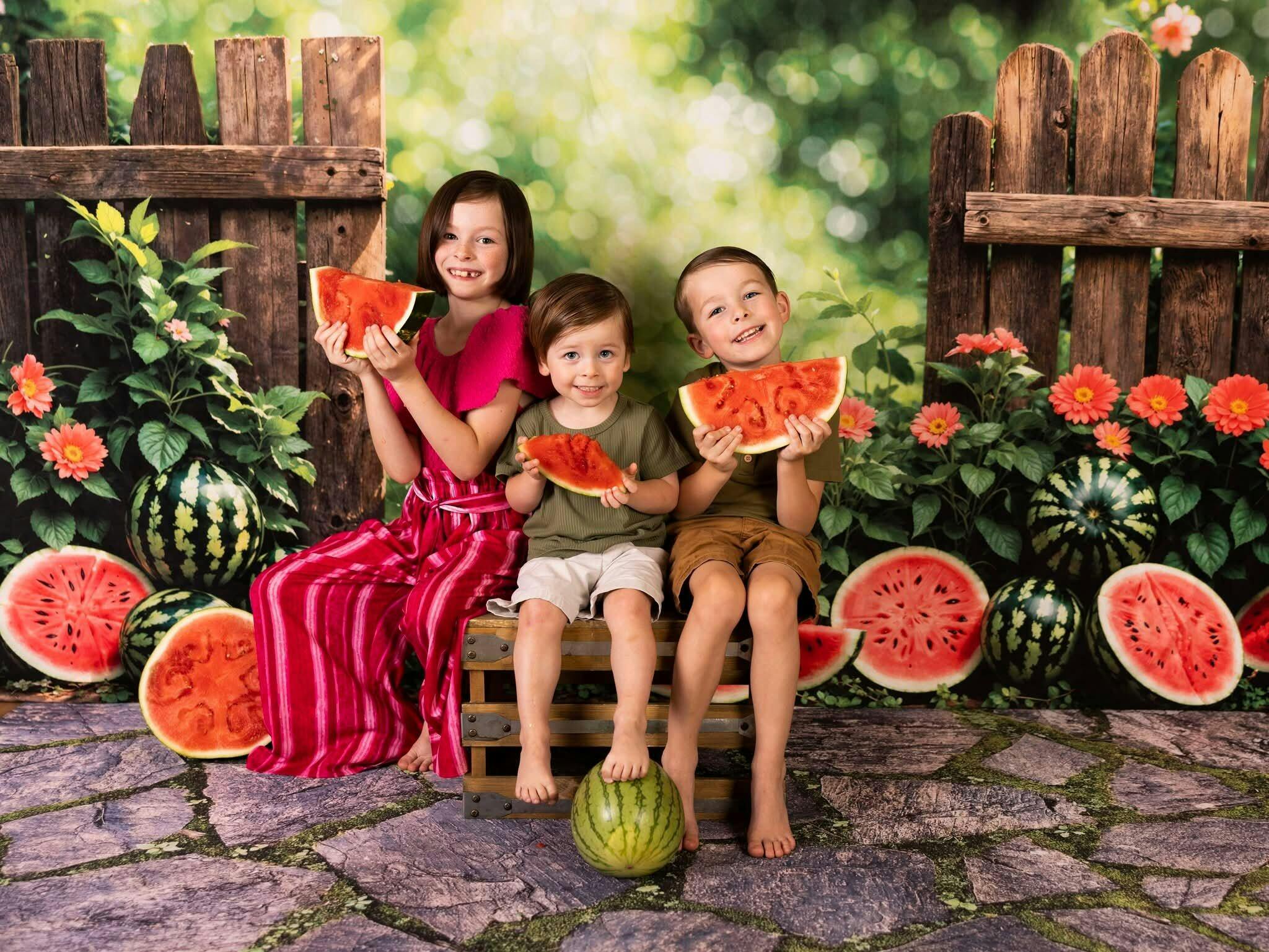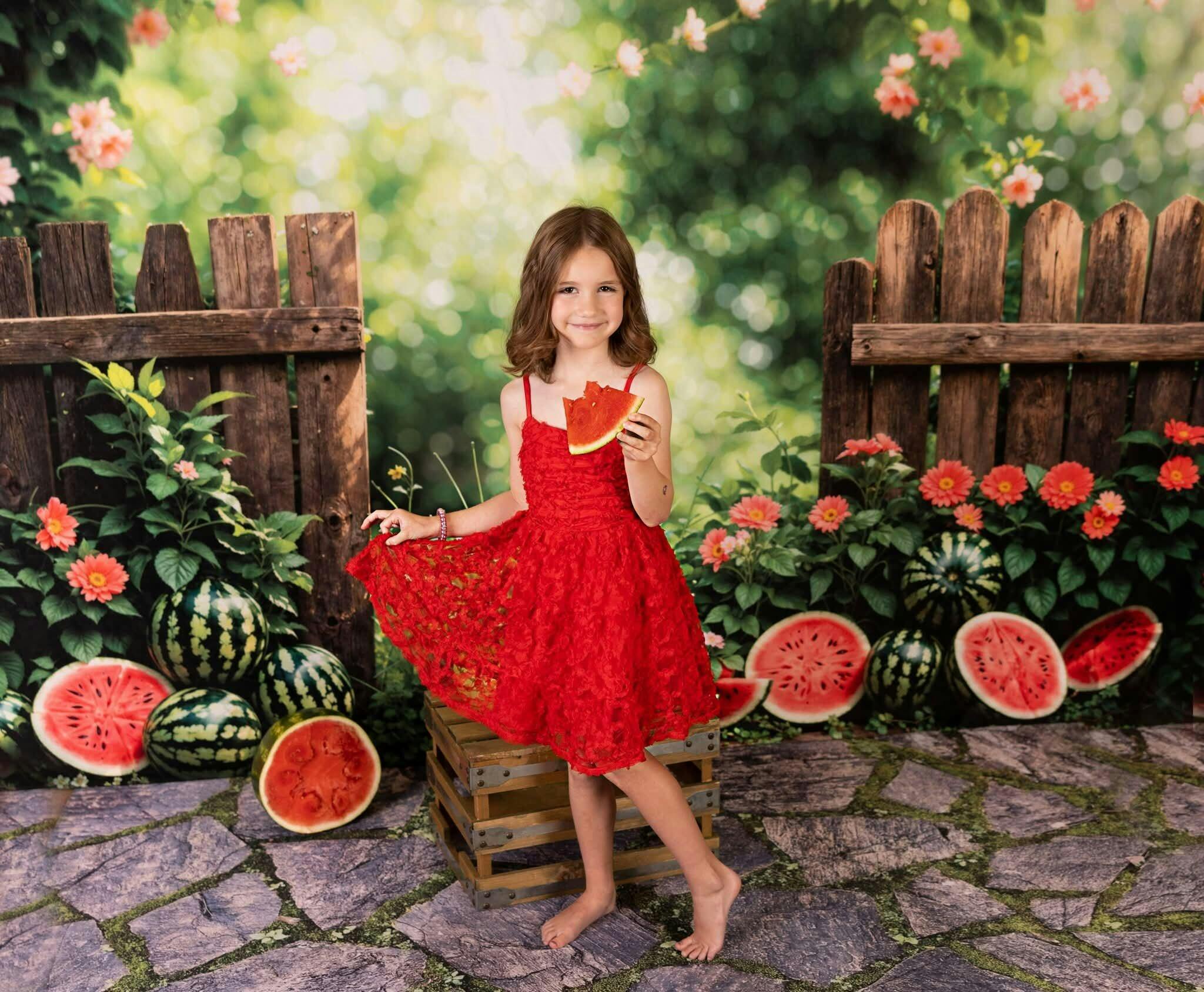 Enhance your photos with the vibrant charm of the Rustic Garden Watermelon Summer Backdrop. Featuring fresh watermelon slices and lush greenery against a wooden fence, this backdrop brings a warm, natural vibe perfect for summer-themed shoots, adding a refreshing and colorful touch to every portrait.