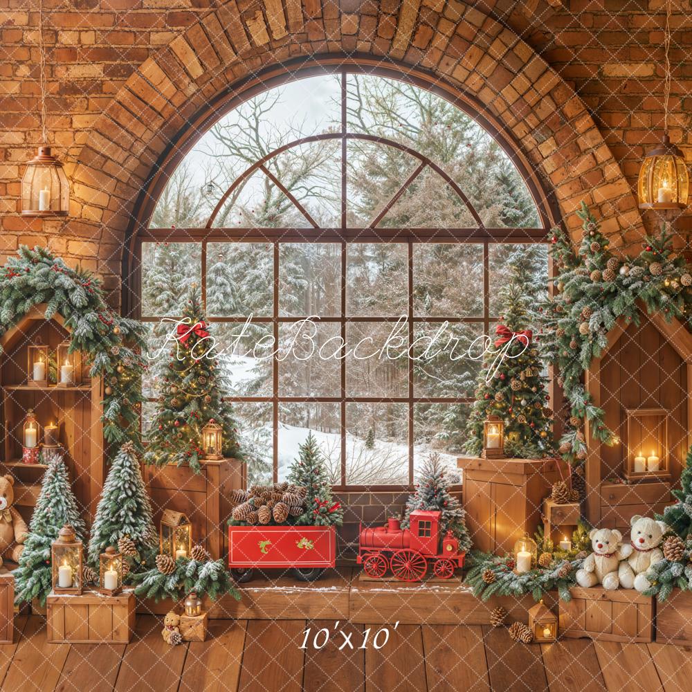 Transform your holiday photos with the Cozy Rustic Winter Christmas Backdrop, featuring charming pine trees, warm candlelight, and festive decor against a snowy window scene. Perfect for capturing the warmth and magic of winter celebrations in a timeless rustic style.