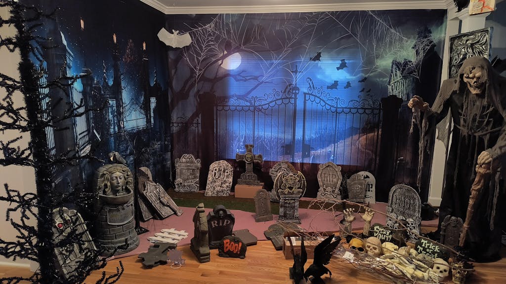 Create a chilling atmosphere with the Eerie Haunted Cemetery Night Backdrop. Featuring dark iron gates, flying bats, a spooky moonlit sky, and a haunted mansion silhouette, this backdrop is perfect for captivating Halloween-themed portraits and eerie photo shoots. Its atmospheric design adds depth and mystery to any scene.