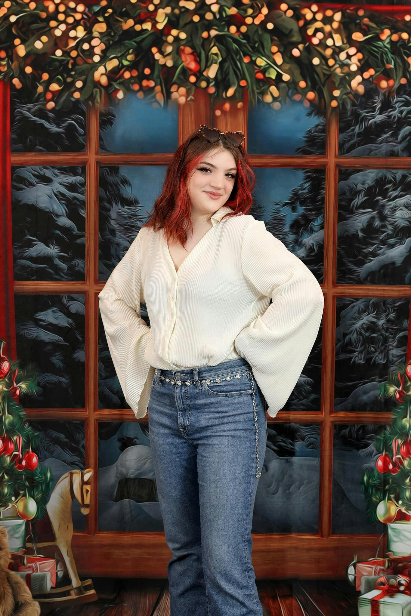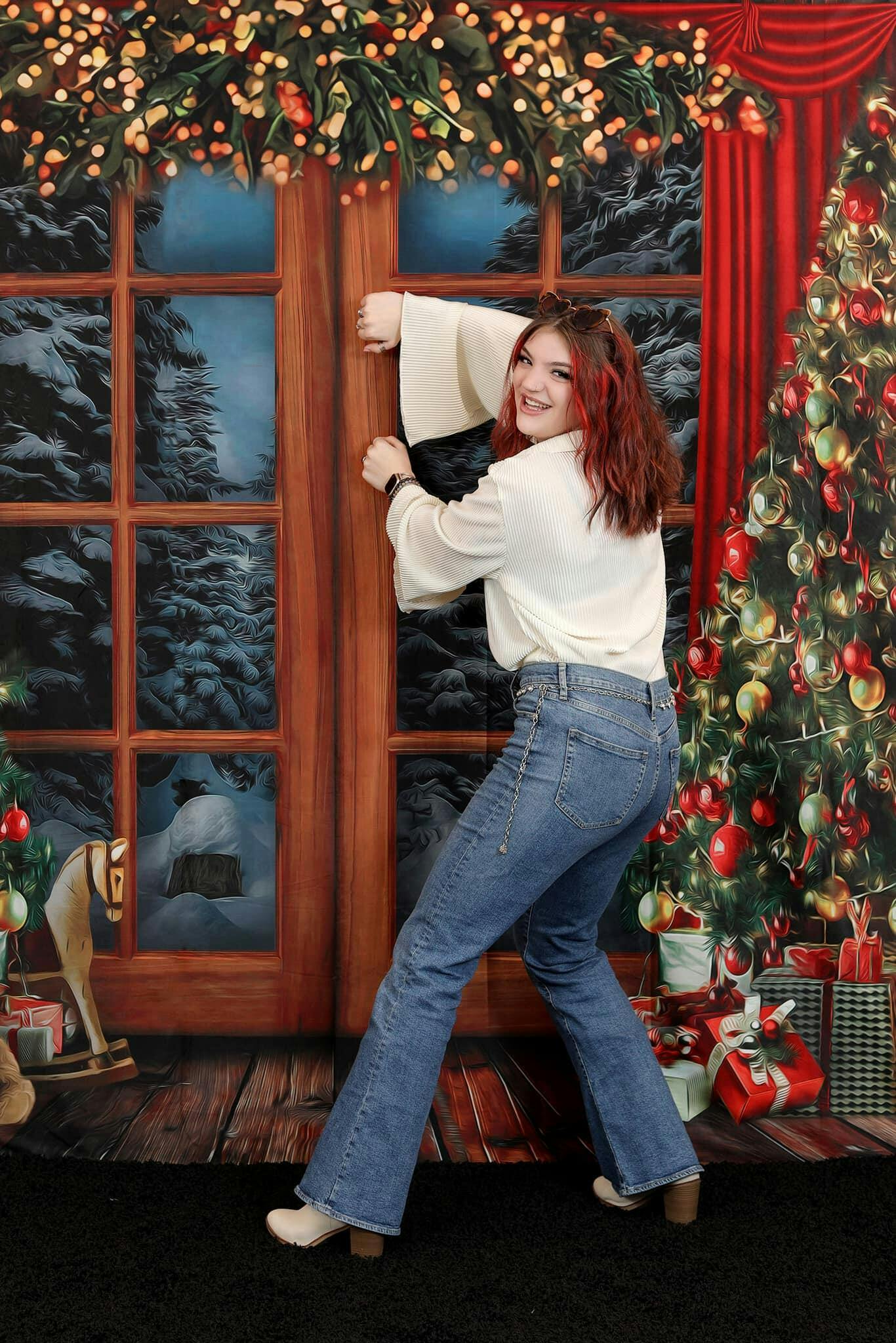 Create a warm and inviting holiday scene with the Cozy Festive Winter Window Backdrop. Featuring beautifully decorated Christmas trees, glowing string lights, and a snowy outdoor view, this backdrop adds seasonal charm and elegance to any portrait session or festive photoshoot.