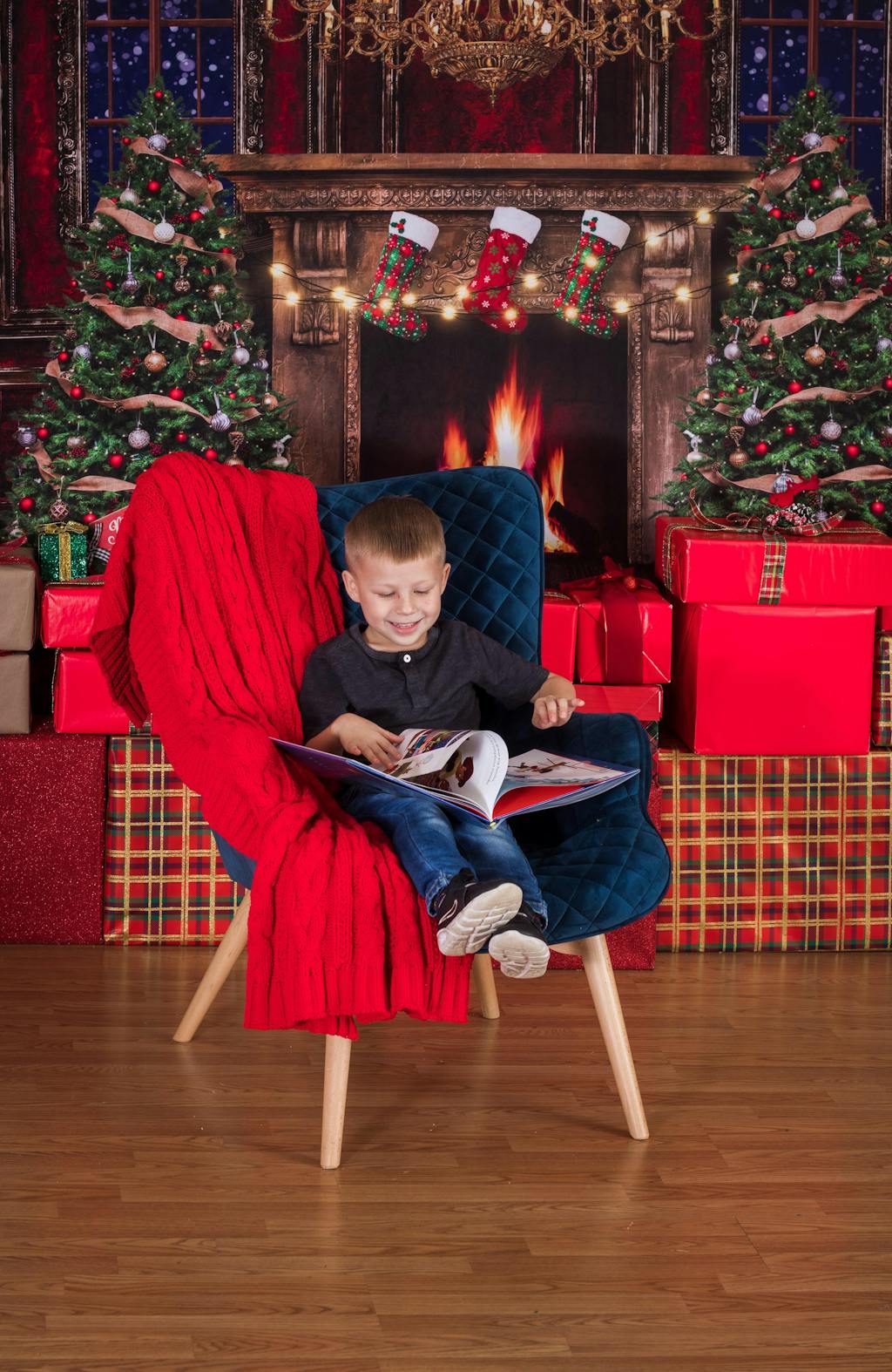 Create a warm and festive atmosphere with the Cozy Classic Holiday Fireplace Backdrop. Featuring a roaring fire, elegant chandelier, and beautifully decorated Christmas trees, this backdrop brings timeless holiday charm to any portrait session. Perfect for capturing seasonal memories with an inviting and luxurious ambiance.