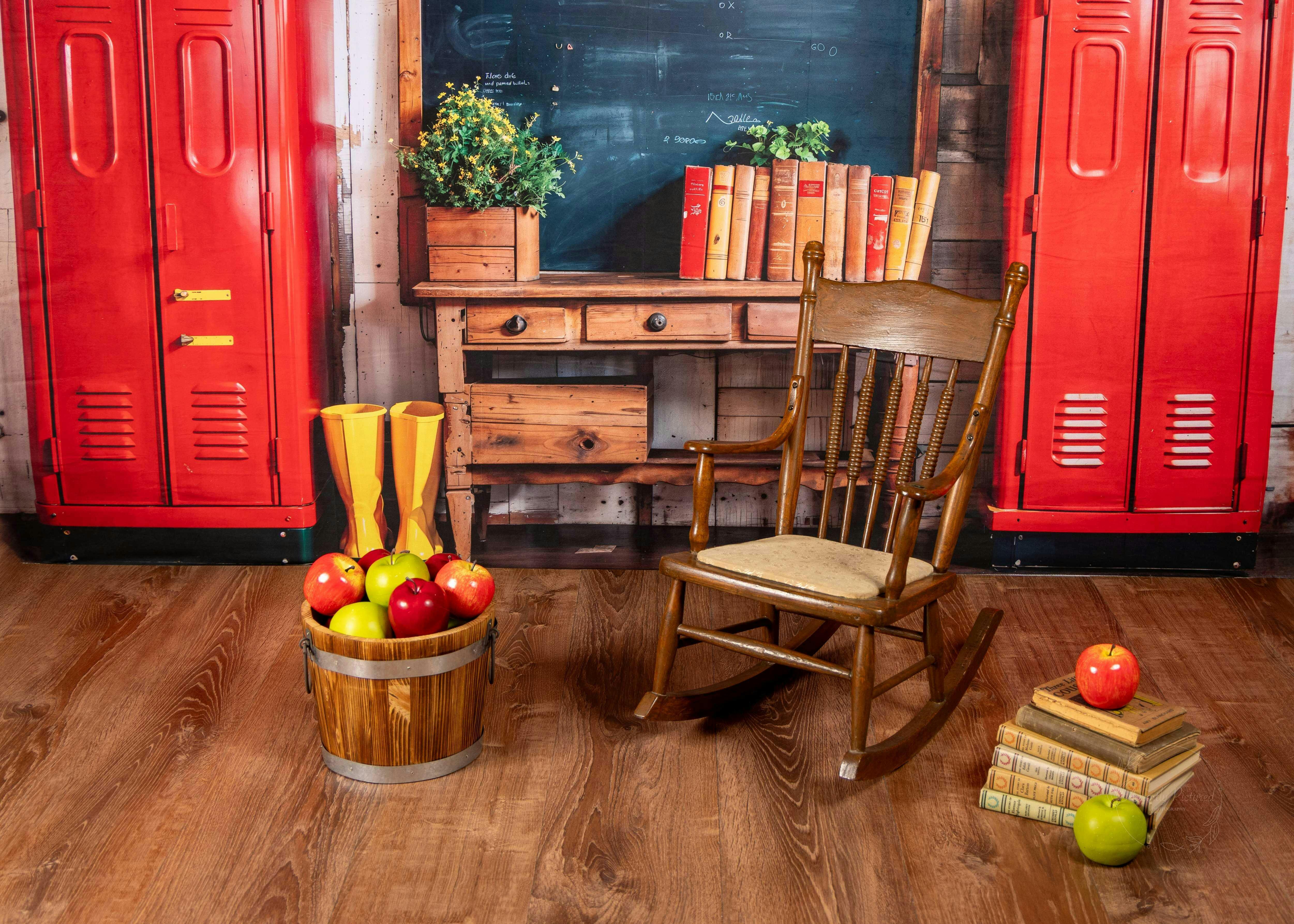 Elevate your photography with the Rustic Vintage Schoolroom Study Backdrop, featuring charming red lockers, a wooden desk, and a classic chalkboard. Perfect for creating nostalgic, cozy scenes, this backdrop adds a warm and inviting atmosphere to your shoots. Ideal for educational, vintage, or lifestyle portraits.