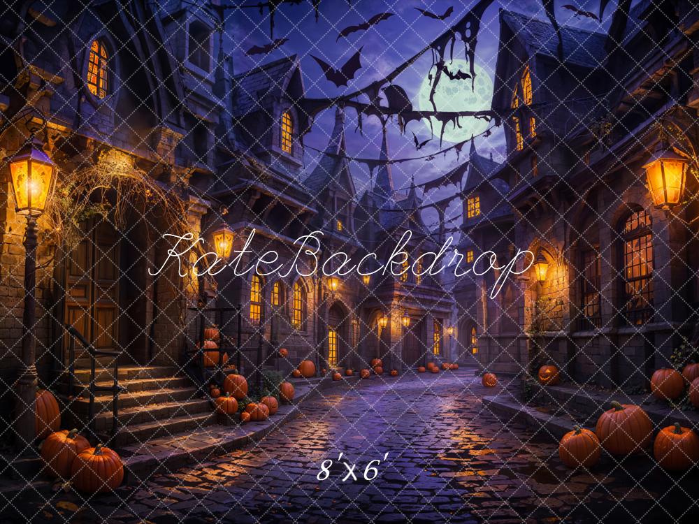 Create an eerie and magical atmosphere with the Spooky Halloween Night Street Backdrop. Perfect for festive photoshoots, this backdrop features glowing street lamps, carved pumpkins, and a haunting full moon sky to set the perfect Halloween mood. Ideal for seasonal portraits and themed events.