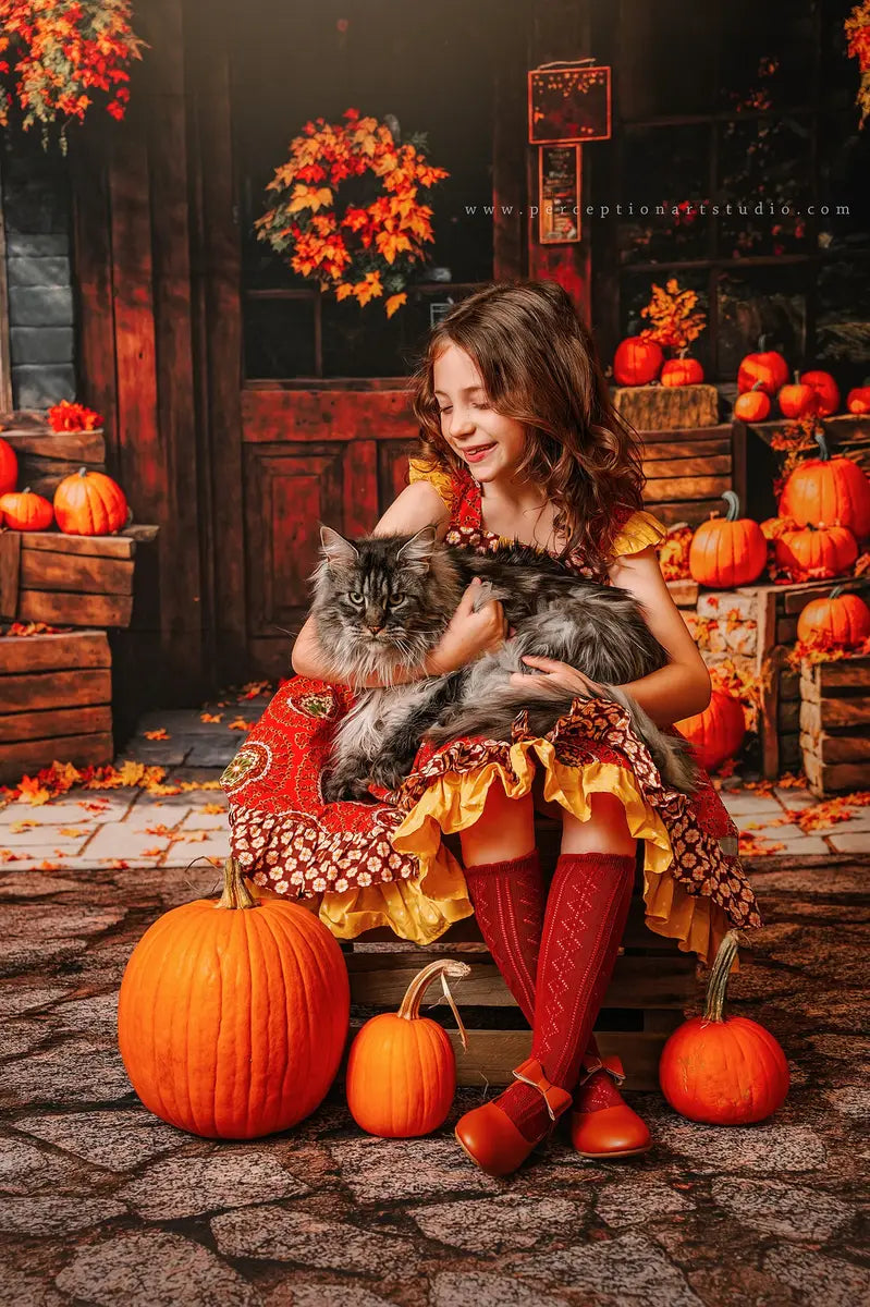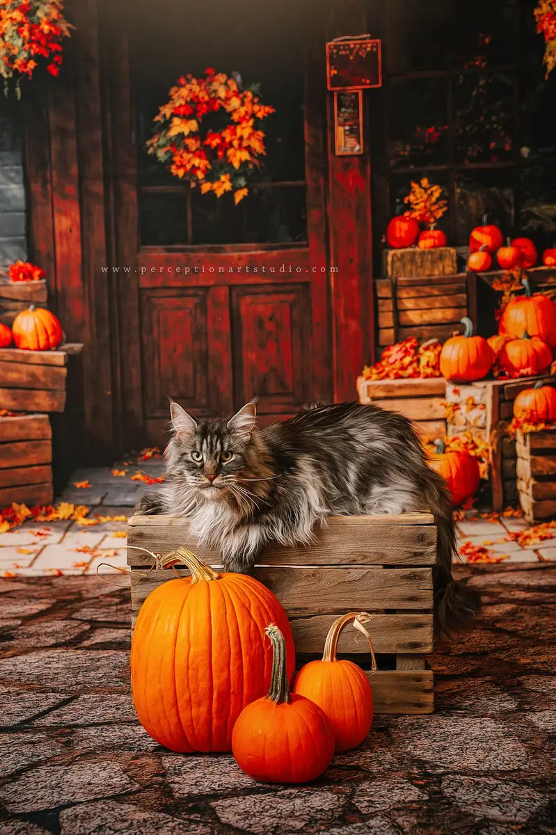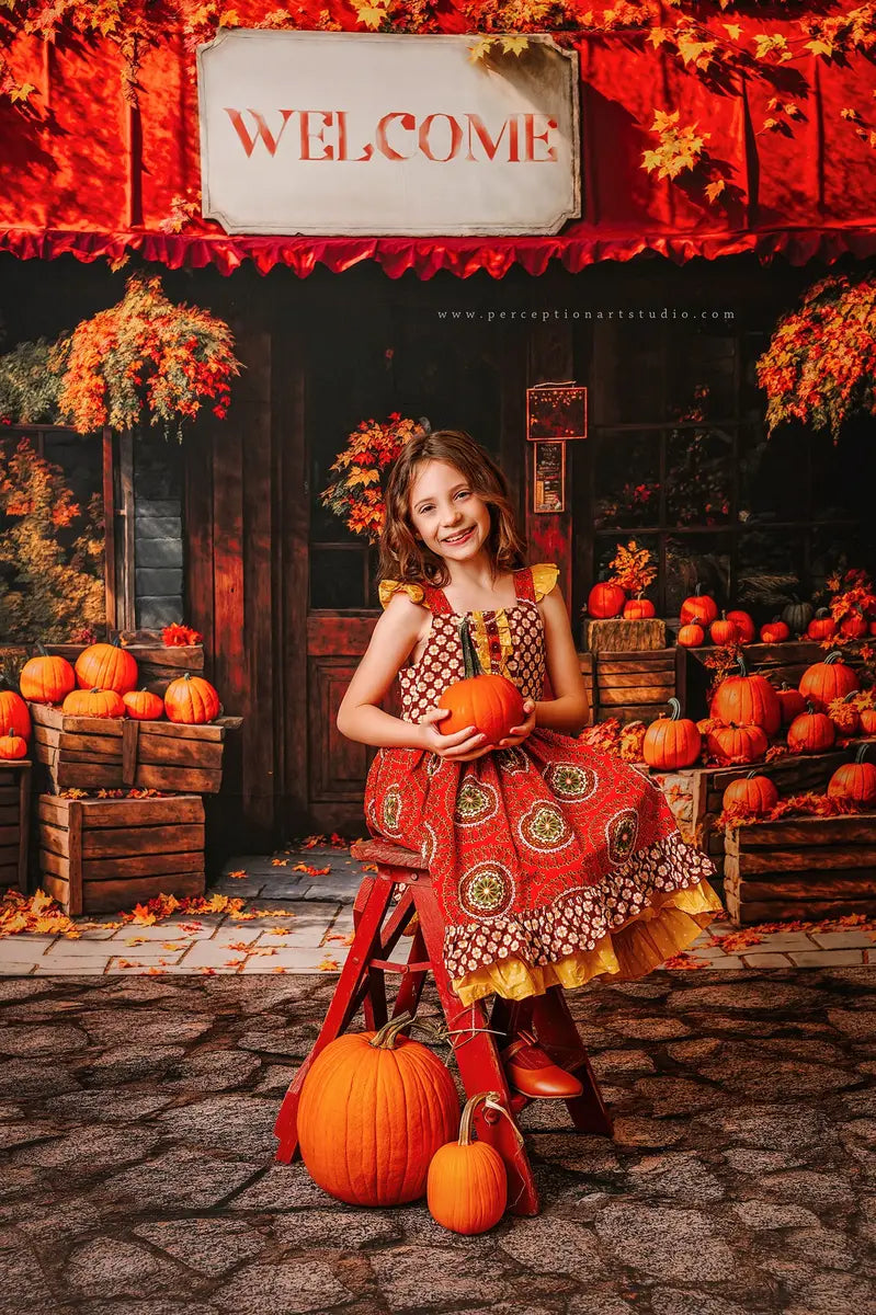 Create warm seasonal portraits with the Autumn Harvest Rustic Pumpkin Street Backdrop. This charming design captures the essence of fall with rich orange pumpkins, vibrant autumn leaves, and a cozy vintage storefront perfect for festive photoshoots and cozy portrait sessions.