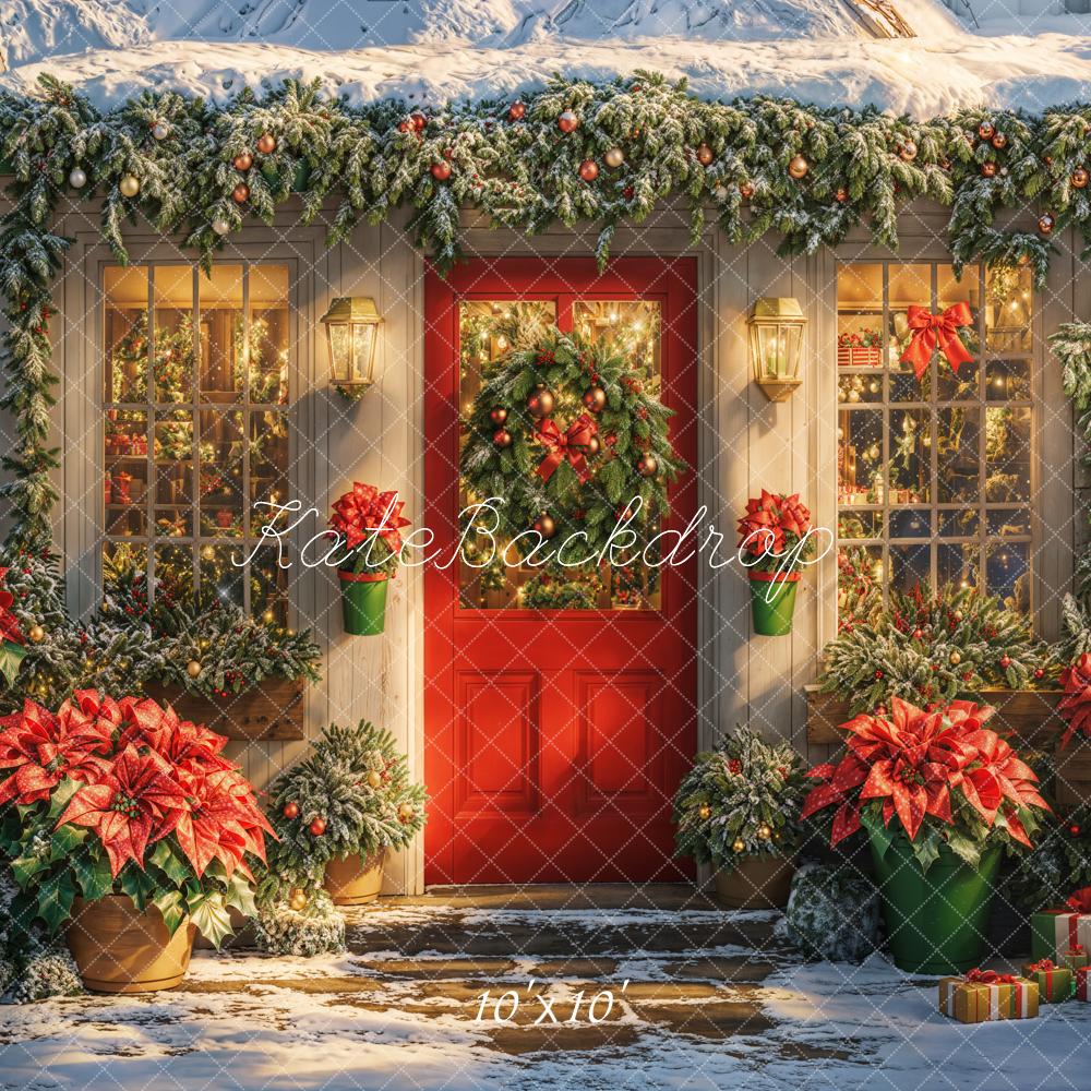Create a warm and inviting holiday scene with the Festive Winter Holiday Doorway Backdrop. This charming design features a snow-covered entrance adorned with vibrant poinsettias and lush greenery, perfect for seasonal portraits and festive photo shoots. Elevate your studio's holiday offerings with this uniquely detailed backdrop.
