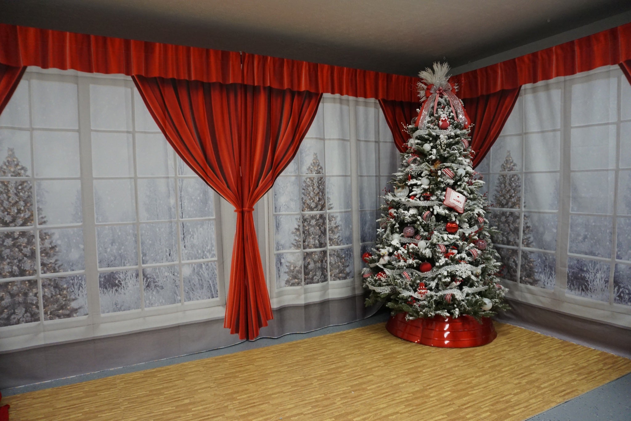 Capture the cozy spirit of winter with the Snowy Window View Holiday Curtain Backdrop. Featuring vibrant red curtains framing a frost-covered window with a decorated Christmas tree, this backdrop creates a warm and festive atmosphere perfect for seasonal portraits and holiday events.