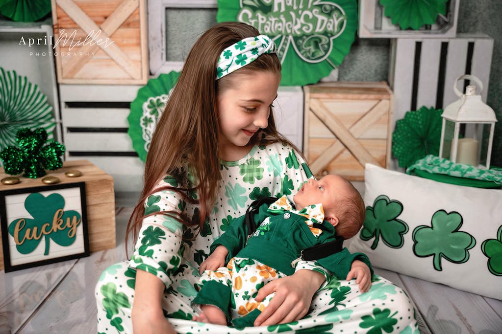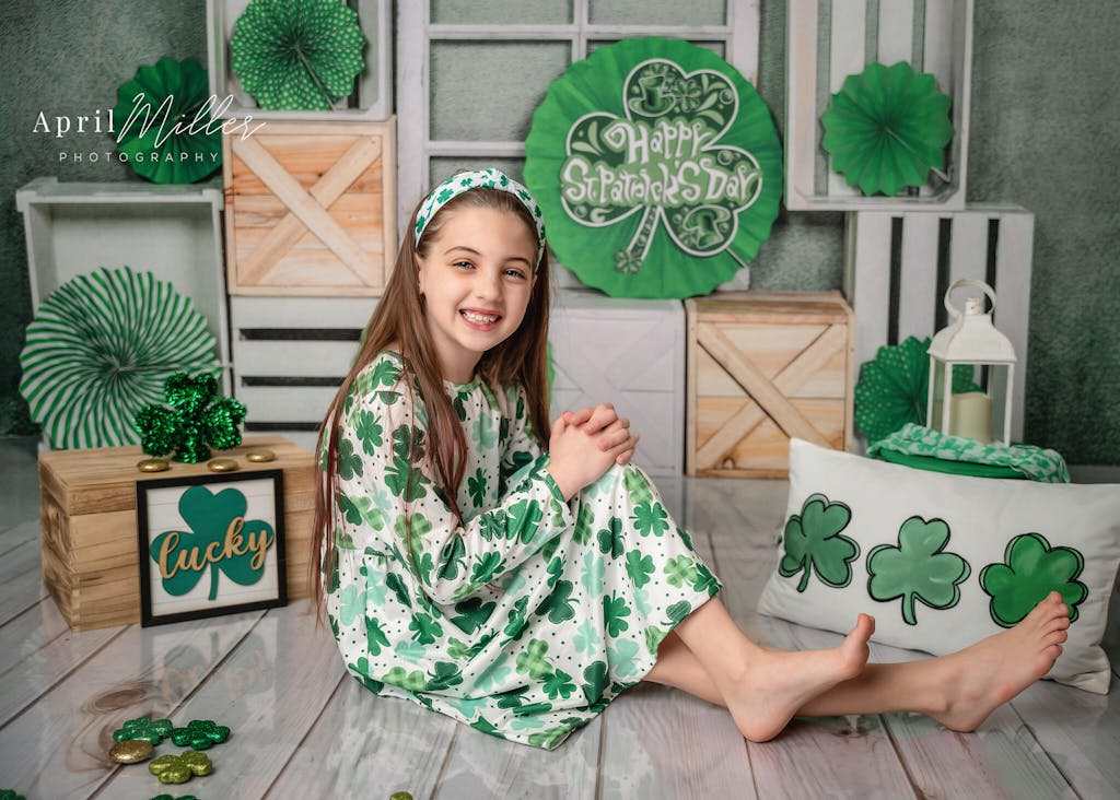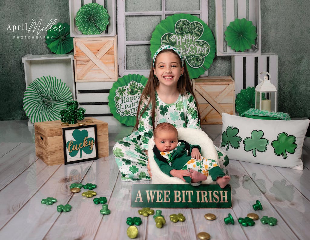 Celebrate the festive charm with the St. Patrick's Day Rustic Green Backdrop. Featuring vibrant green shamrocks and rustic wooden crates, this backdrop adds a lively yet cozy feel to any event or photo shoot. Perfect for holiday portraits and themed celebrations.