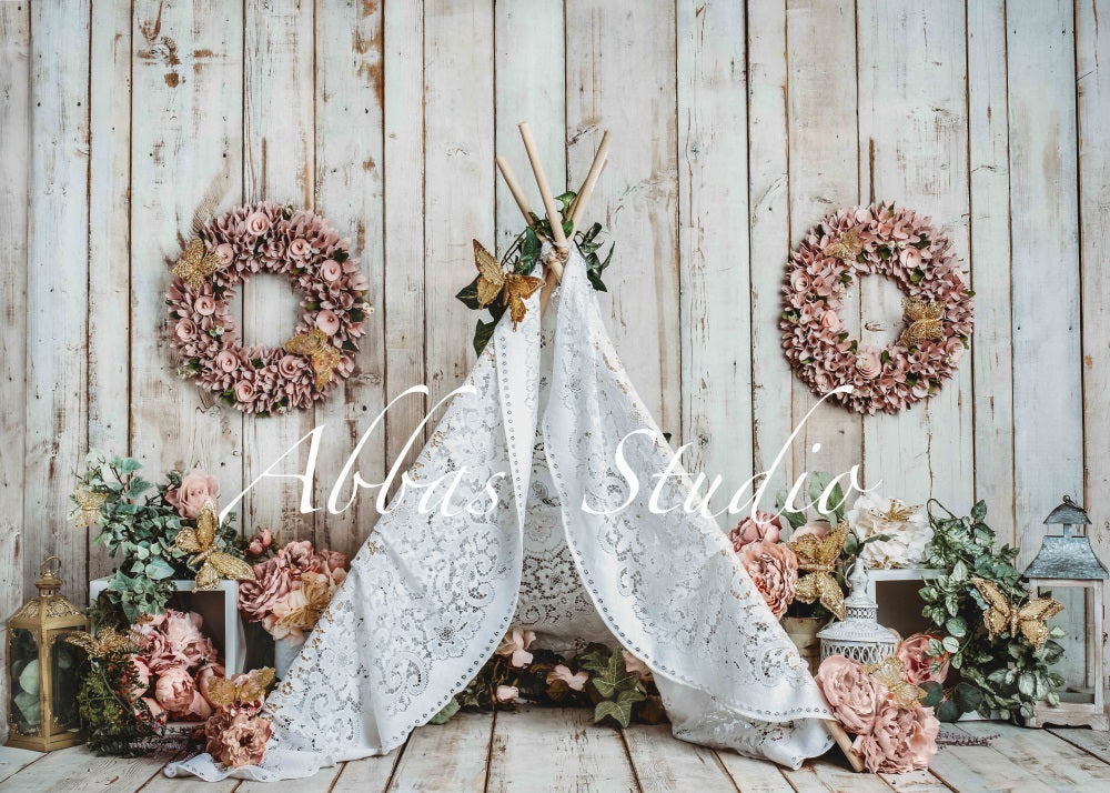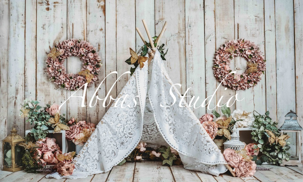 Create a charming and whimsical setting with the Rustic Floral Boho Tent Backdrop. Featuring vintage wooden panels, soft floral wreaths, and delicate lace details, this backdrop adds a cozy, bohemian vibe perfect for portrait sessions and styled photo shoots.
