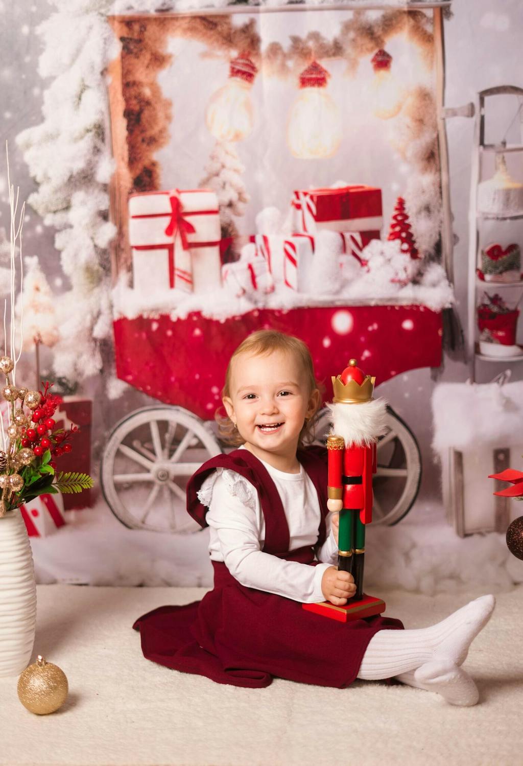 Kate Christmas Winter Gift Boxes Trolley Snow Backdrop Designed by Chain Photography