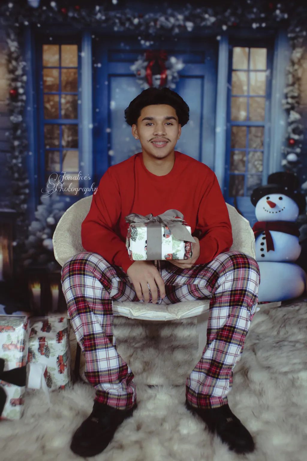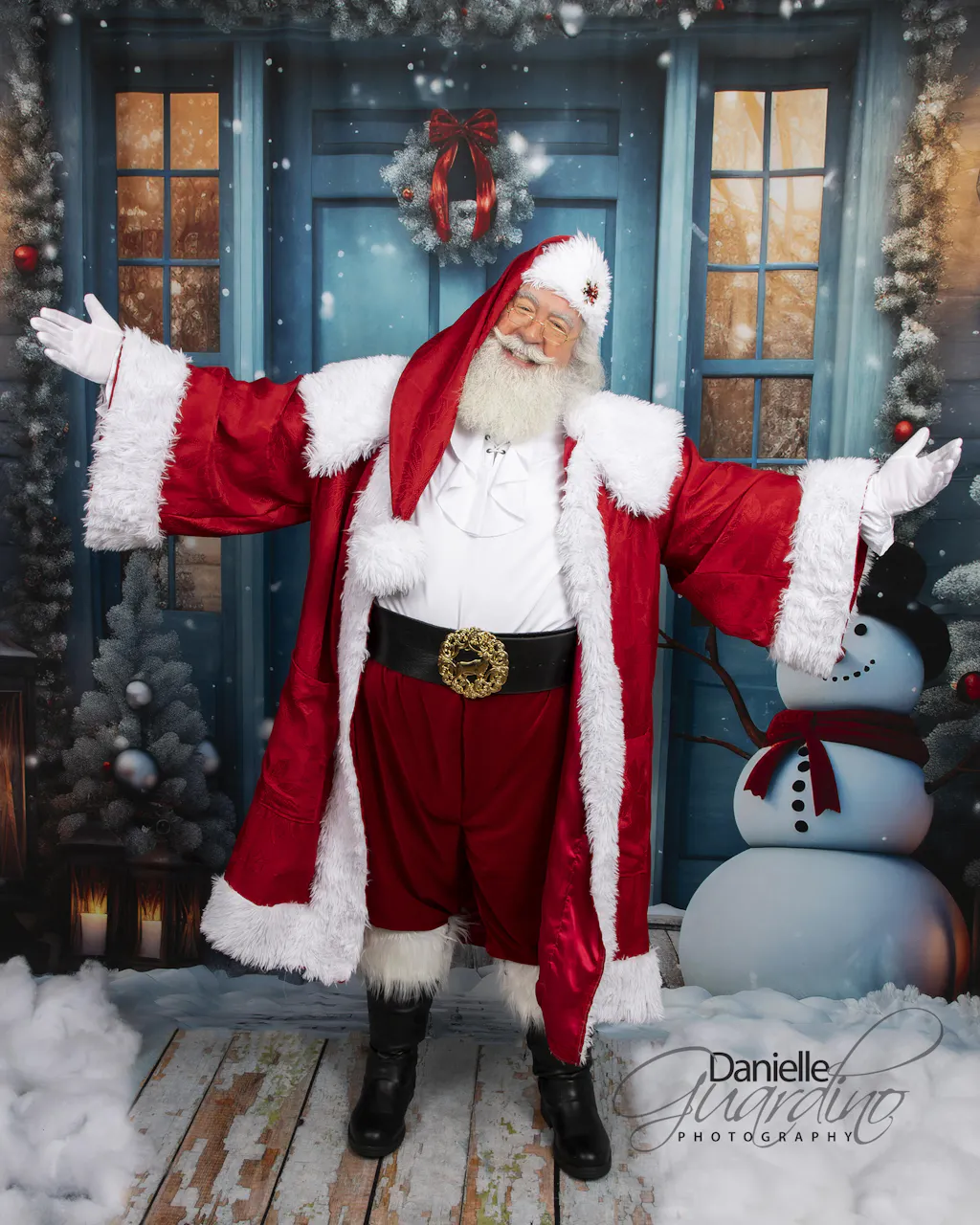 Kate Winter Snowy Blue Door Snowman Printed Backdrop Designed by Chain Photography