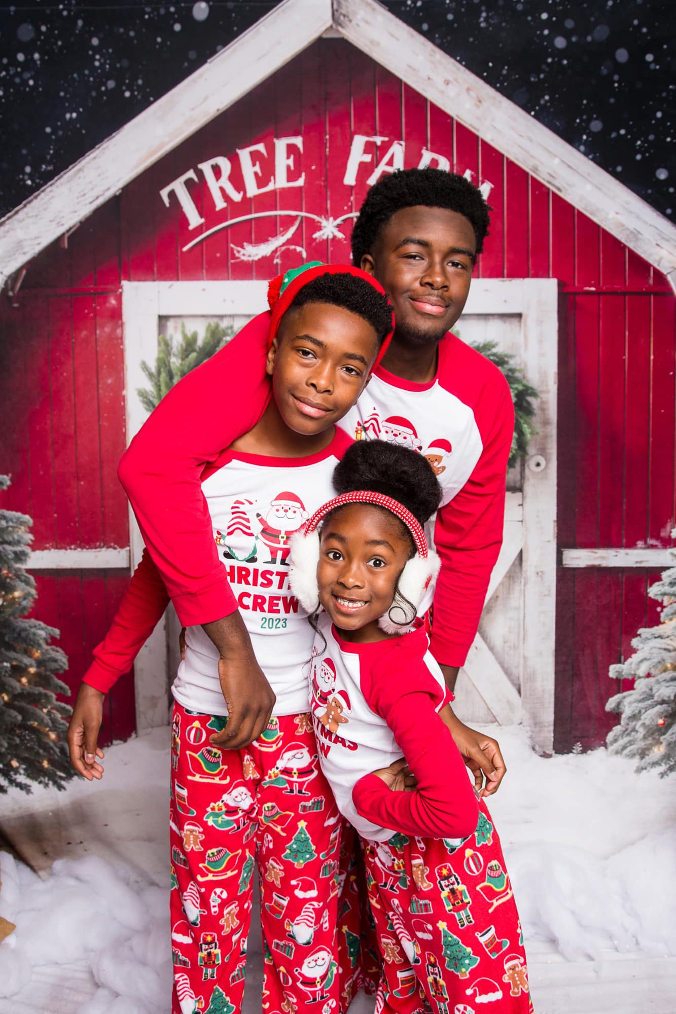 Kate Winter Christmas Tree Farm Red Barn Backdrop Designed by Chain Photography
