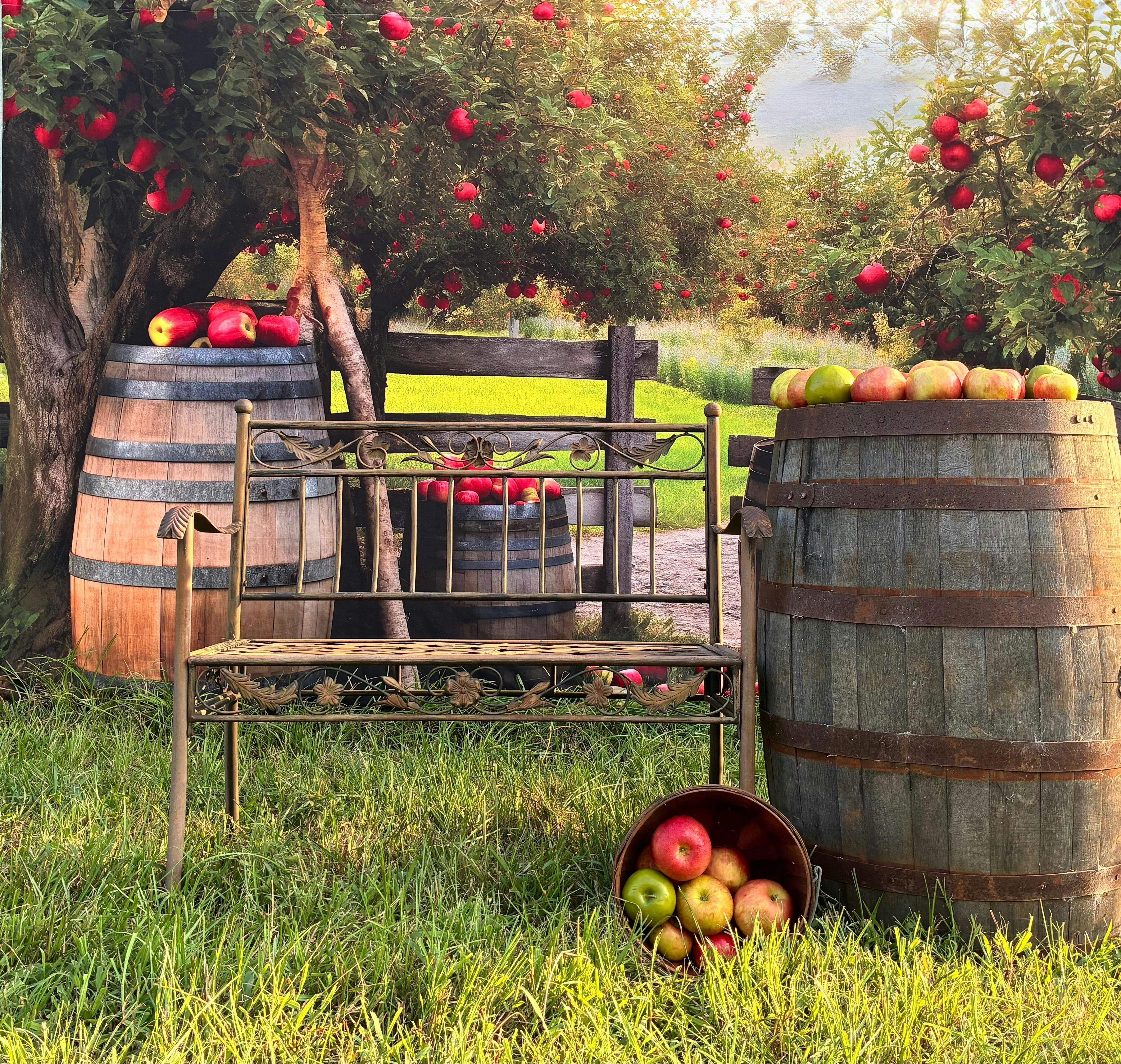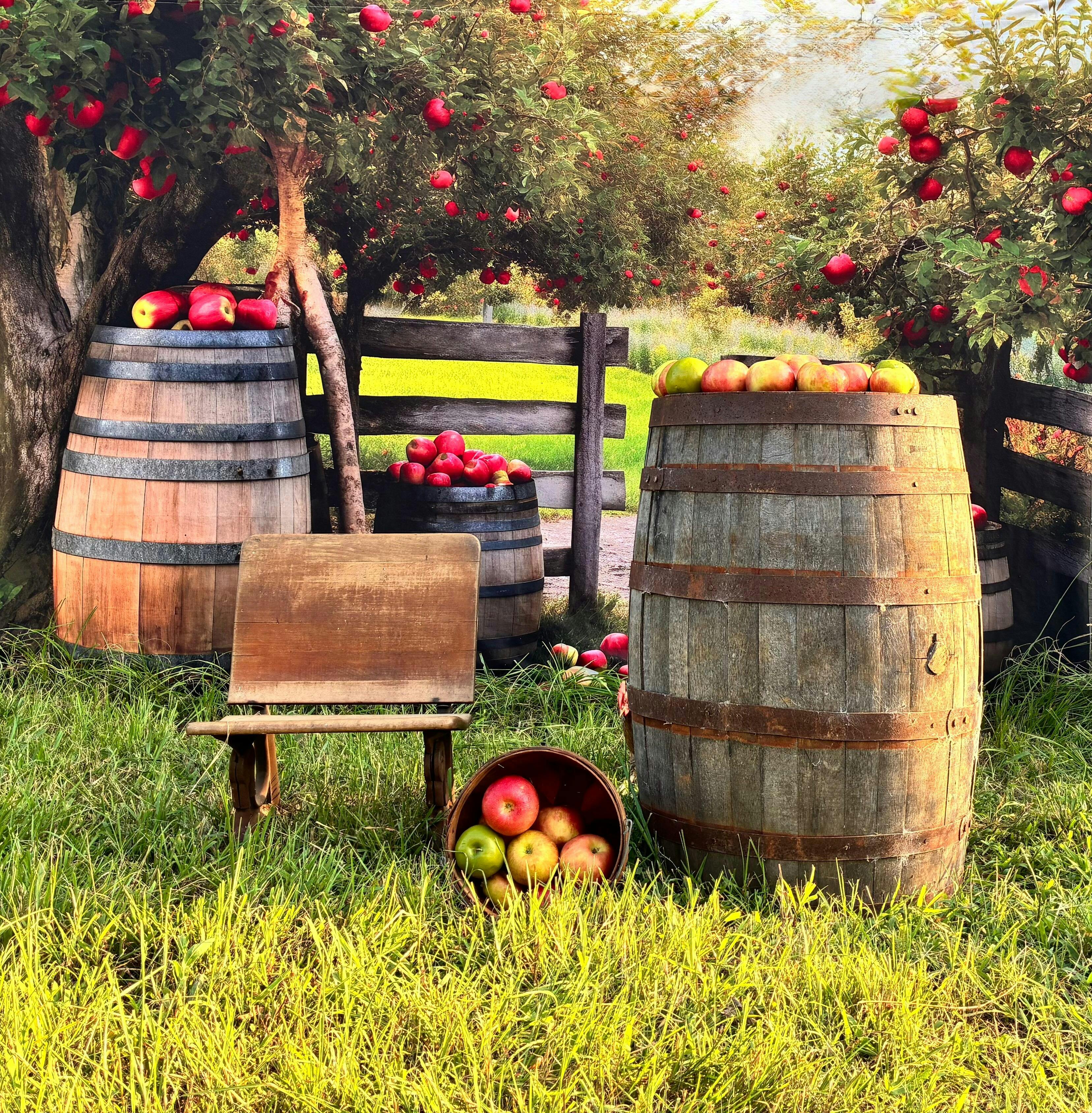 Capture timeless charm with the Rustic Apple Orchard Wooden Barrels backdrop. Featuring lush apple trees, vibrant red fruit, and weathered wooden barrels, this scene is perfect for adding a warm, natural ambiance to your portraits. Ideal for autumn-themed photoshoots and countryside aesthetics.