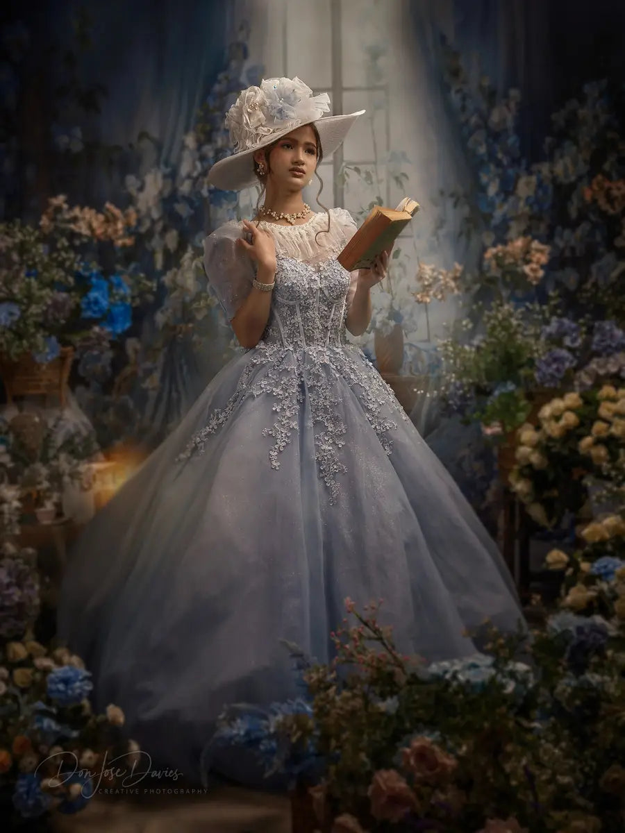 Enhance your portraits with the stunning Elegant Blue Floral Window Backdrop. Featuring delicate blue and white flowers intertwined with sheer drapes around a vintage window, this backdrop adds a soft, romantic atmosphere perfect for capturing timeless beauty in every shot.