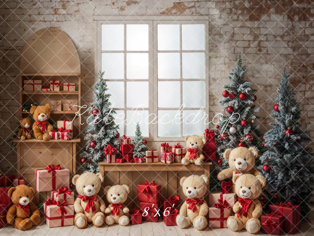 Kate Christmas Teddy Bear White Framed Window Grey Brick Wall Backdrop Designed by Emetselch