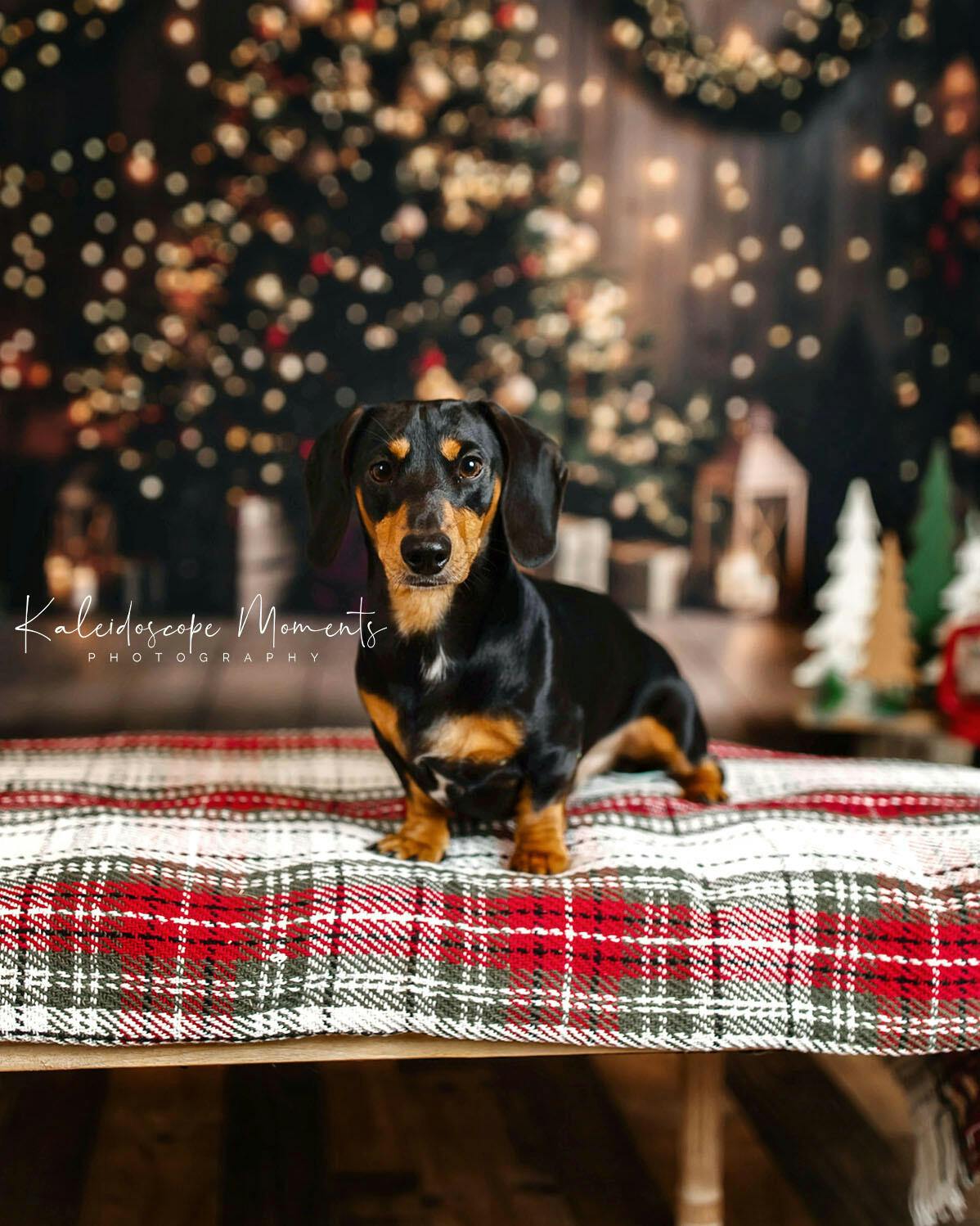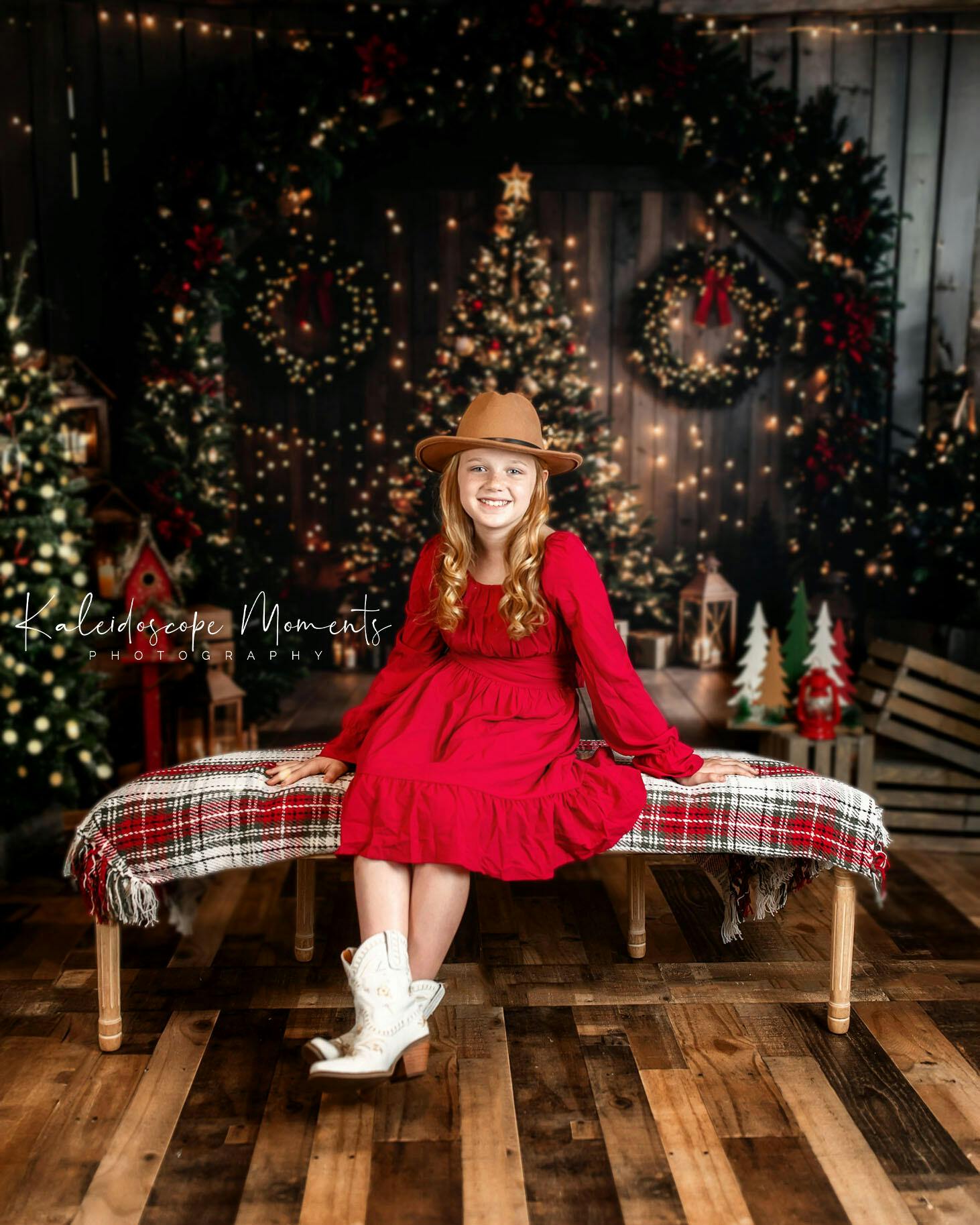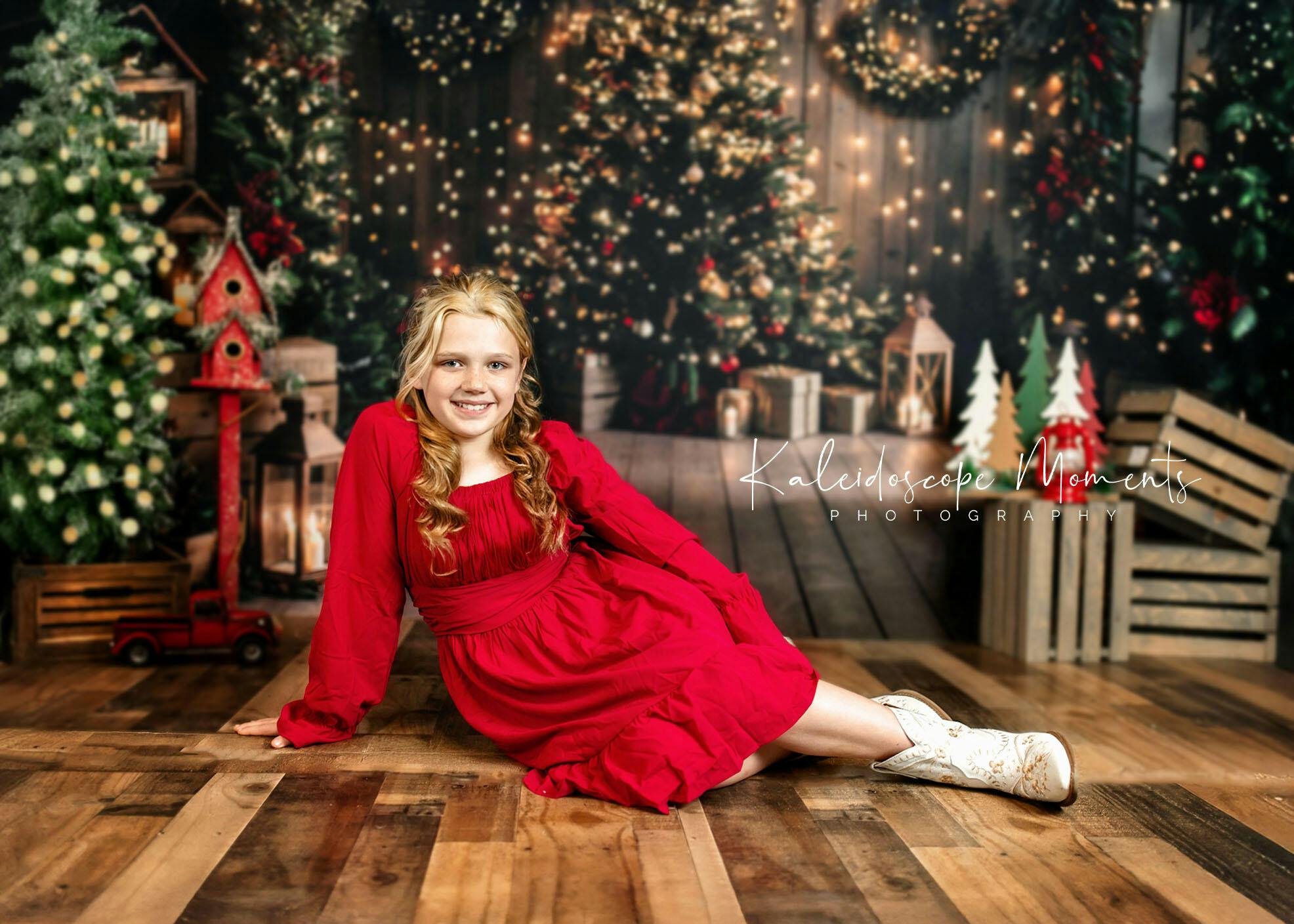 Create magical holiday portraits with the Festive Cozy Christmas Holiday Backdrop. This enchanting backdrop features twinkling lights, decorated Christmas trees, and a warm wooden interior setting, perfect for capturing festive family or seasonal portraits with a cozy and joyful ambiance.