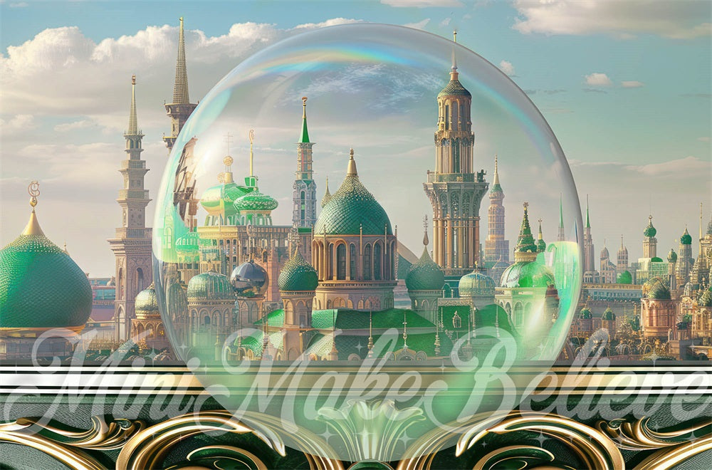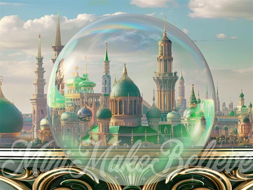 Elevate your photos with the Enchanted Fantasy Cityscape Globe Backdrop, featuring intricate architectural details inside a translucent globe. Perfect for creating dreamy, magical portrait settings that capture imagination and wonder. This backdrop blends surreal cityscape charm with a soft sky ambiance, ideal for standout photography scenes.
