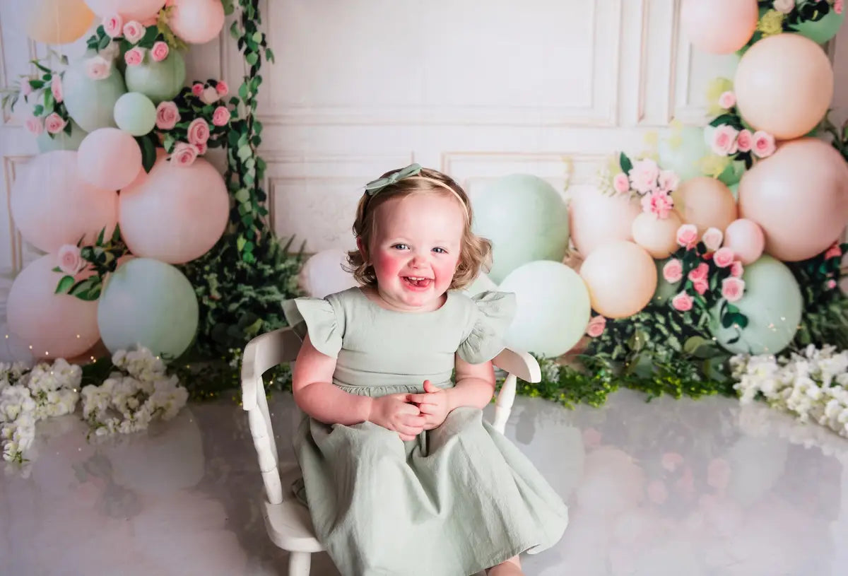 Kate Birthday Pink Rose Green Balloon Arch White Retro Wall Backdrop Designed by Patty Robert