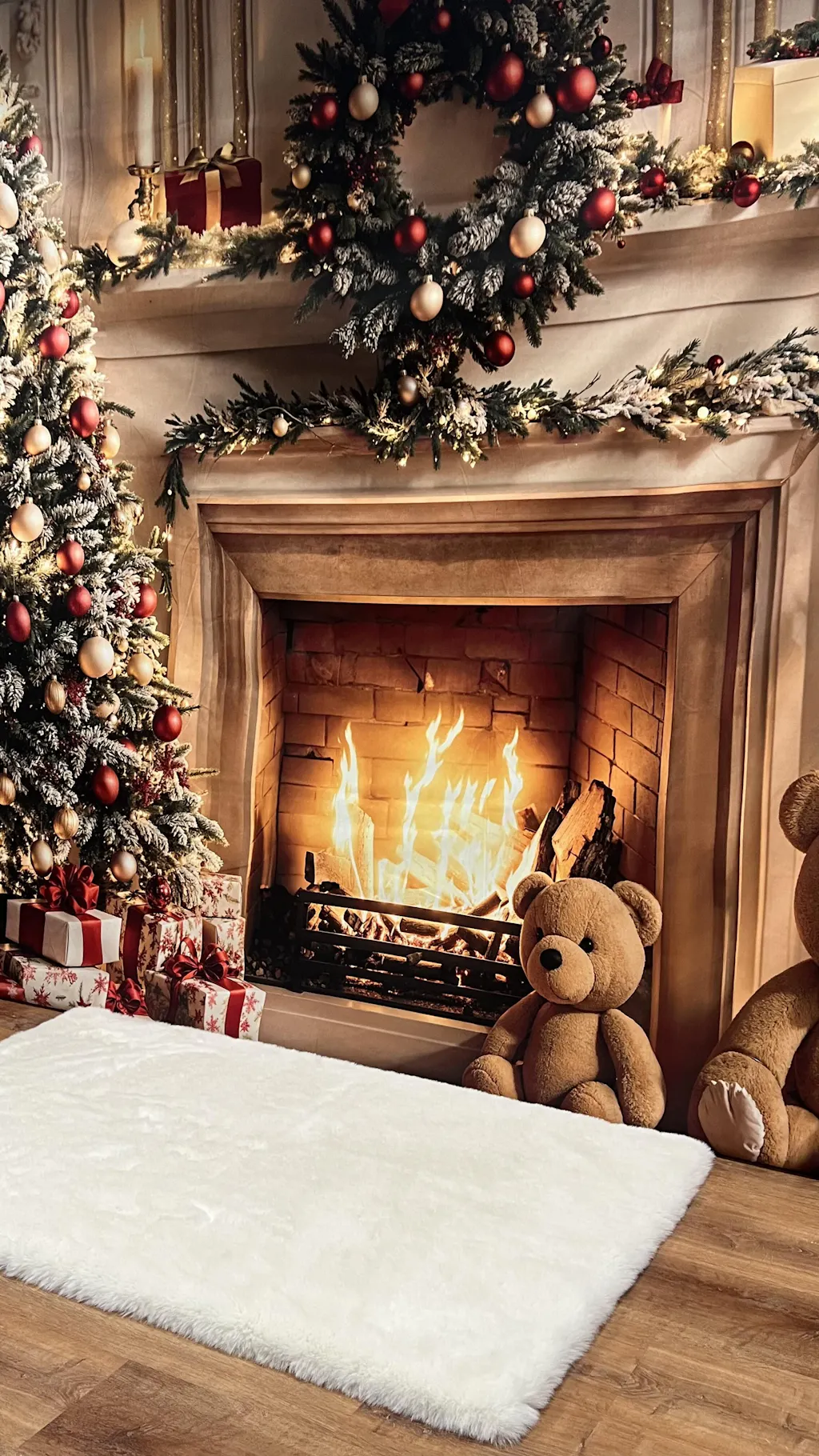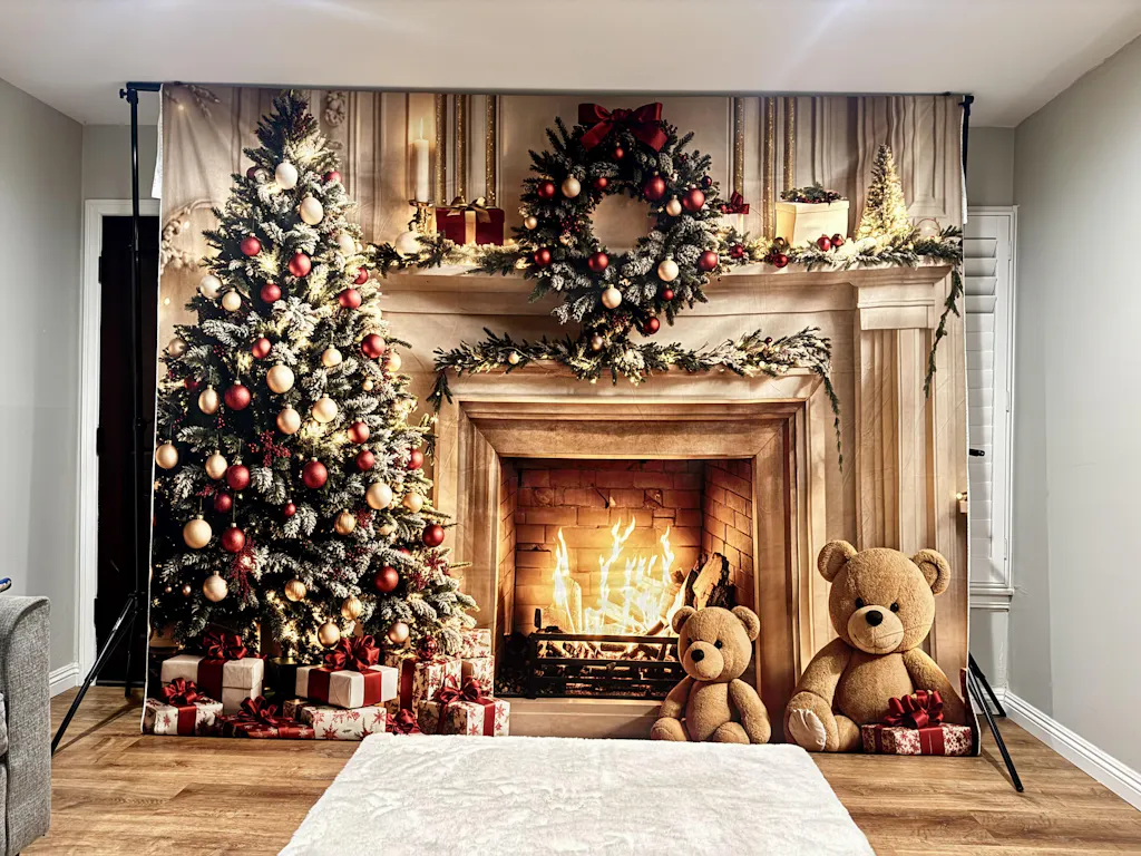 Kate Christmas Tree Fireplace White Retro Wall Printed Backdrop Designed by Emetselch