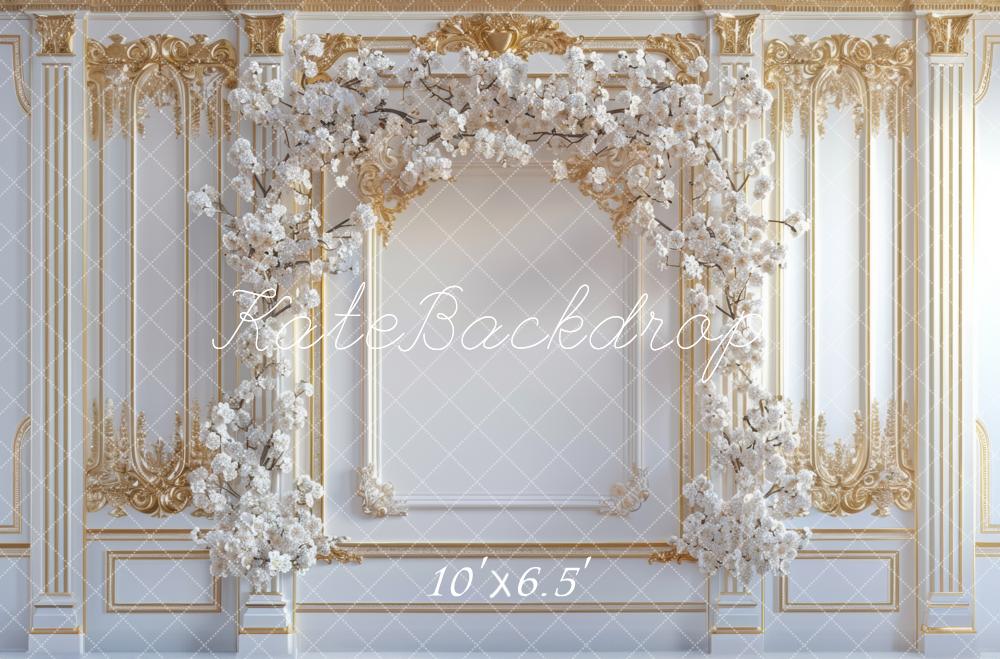 Create stunning portraits with the Elegant White Floral Arch Backdrop, featuring delicate white blossoms arranged in a graceful arch against an ornate gold and white classical wall. Perfect for adding a touch of sophistication and charm to any photo session or event setting.